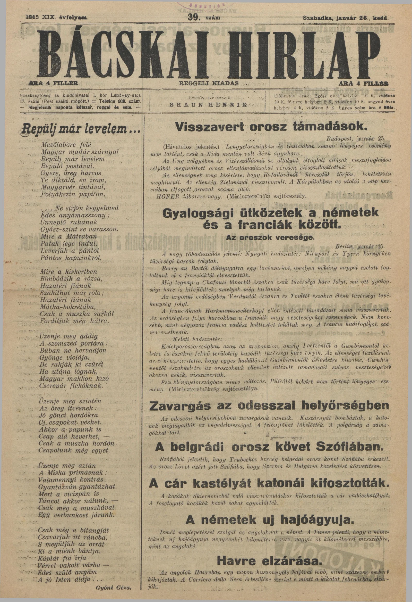 Bácskai Hirlap, 19. évf. 1915. január 26. 39. sz.