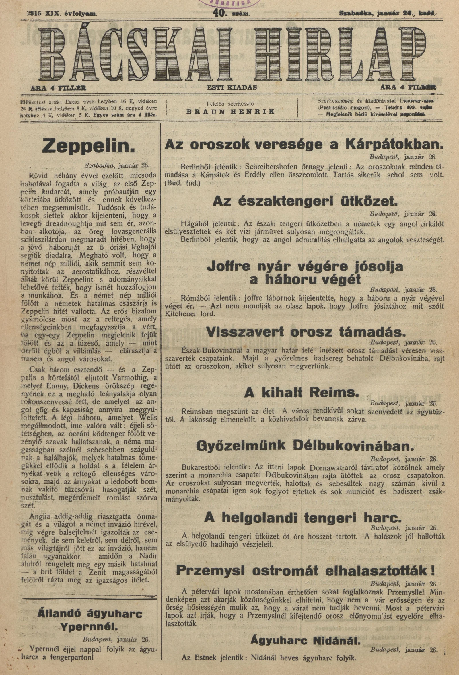 Bácskai Hirlap, 19. évf. 1915. január 26. 40. sz.