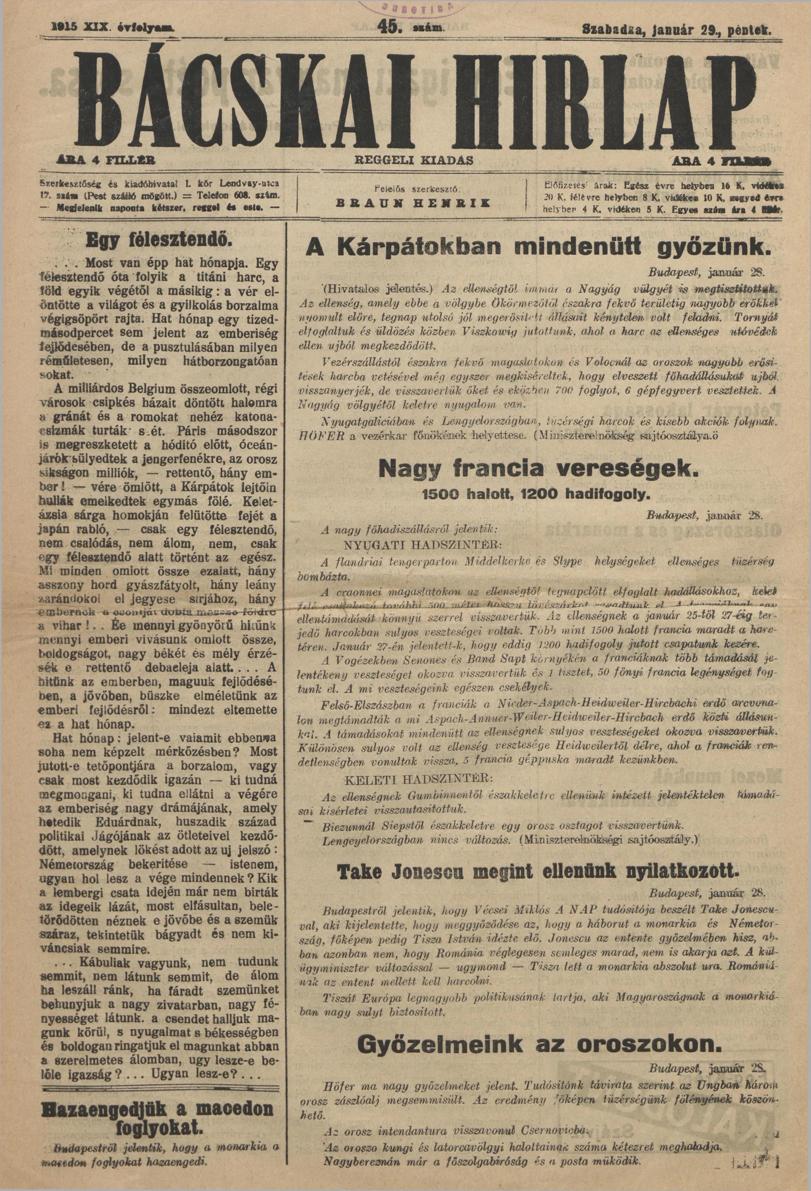 Bácskai Hirlap, 19. évf. 1915. január 29. 45. sz.
