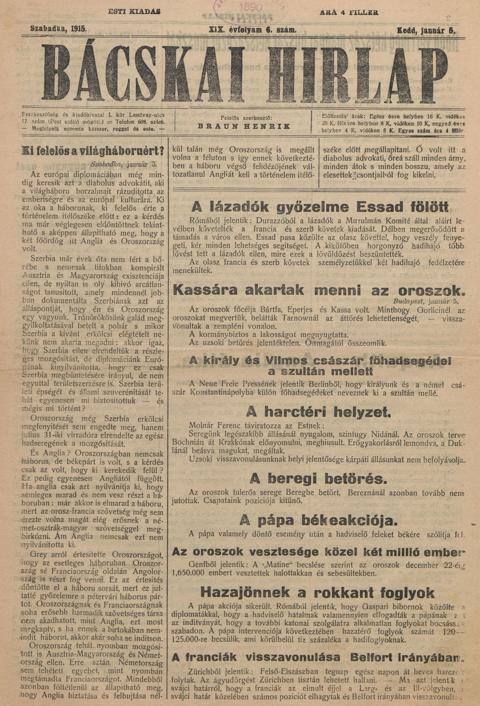 Bácskai Hirlap, 19. évf. 1915. január 5. 6. sz.