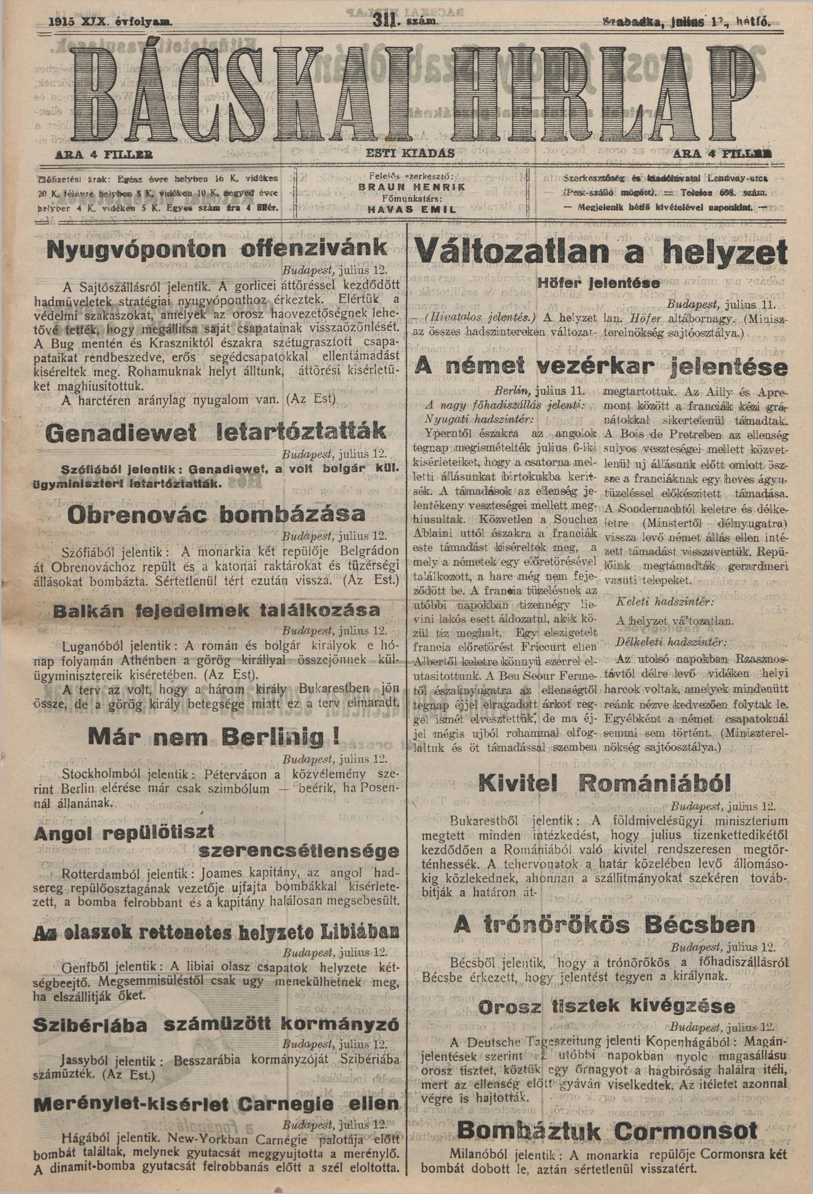 Bácskai Hirlap, 19. évf. 1915. július 12. 311. sz.