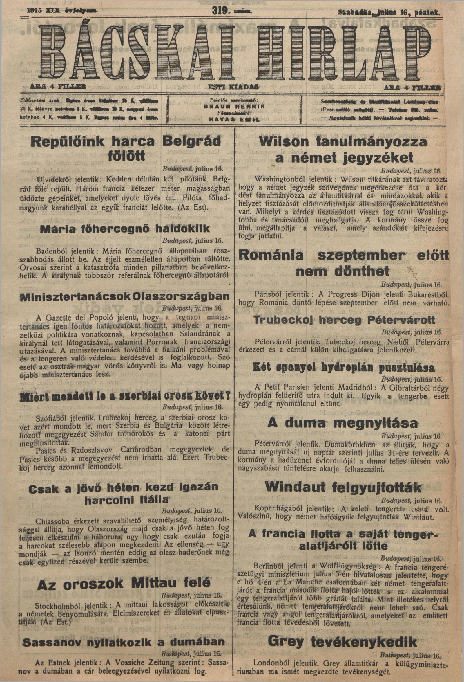 Bácskai Hirlap, 19. évf. 1915. július 16. 319. sz.