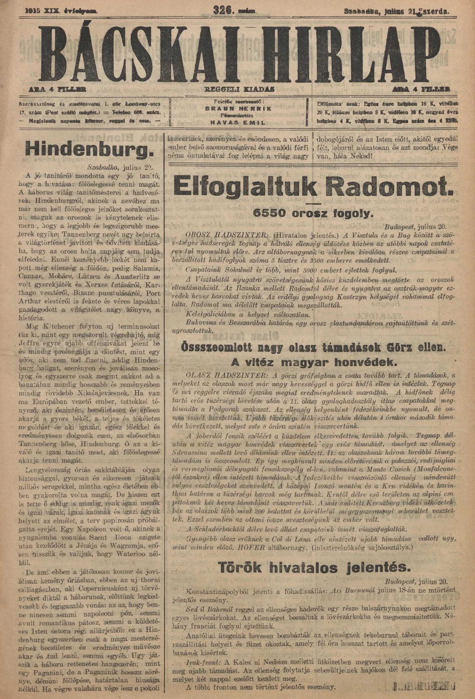 Bácskai Hirlap, 19. évf. 1915. július 21. 326. sz.