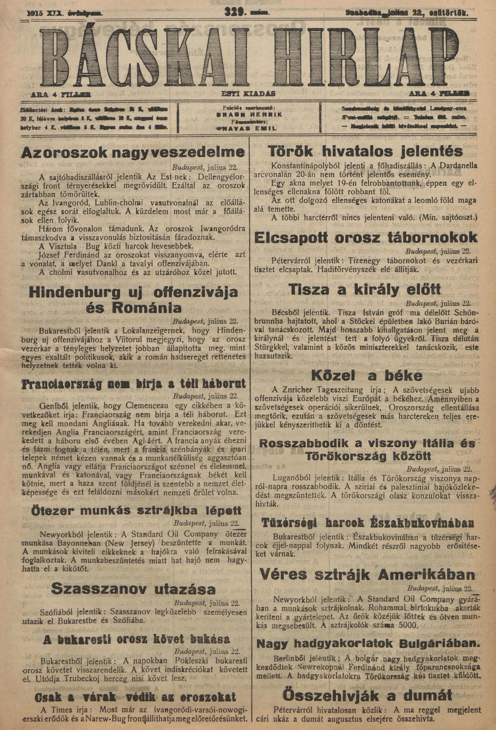 Bácskai Hirlap, 19. évf. 1915. július 22. 329. sz.