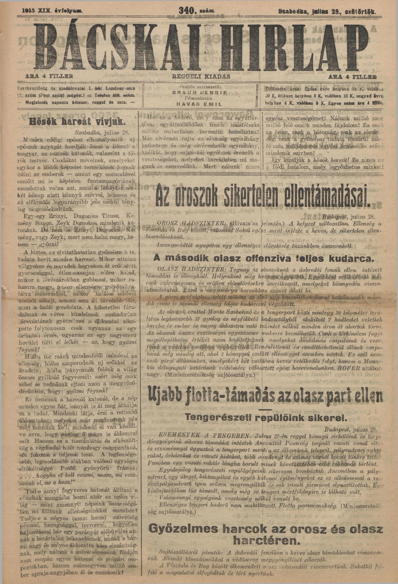 Bácskai Hirlap, 19. évf. 1915. július 29. 340. sz.