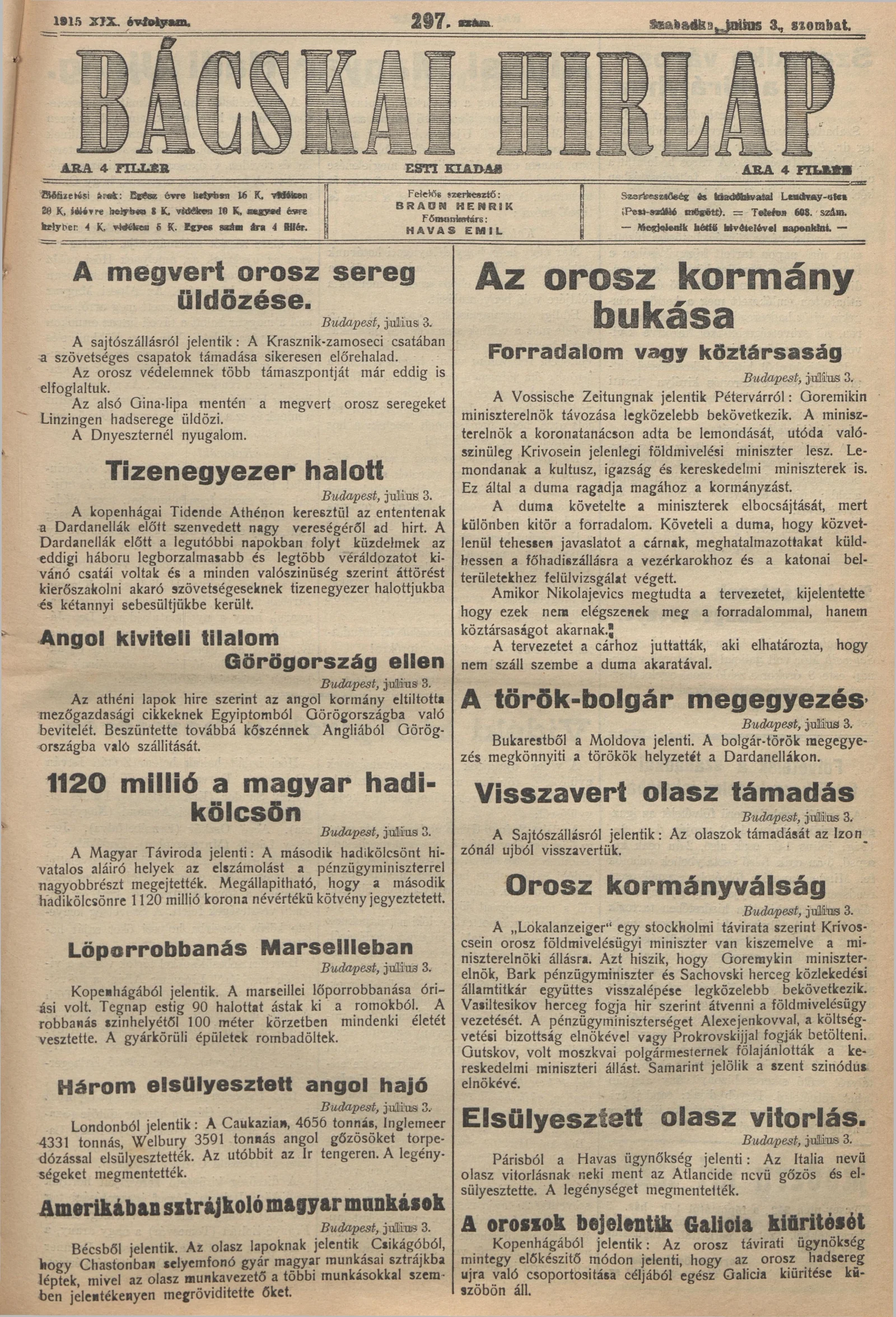 Bácskai Hirlap, 19. évf. 1915. július 3. 297. sz.