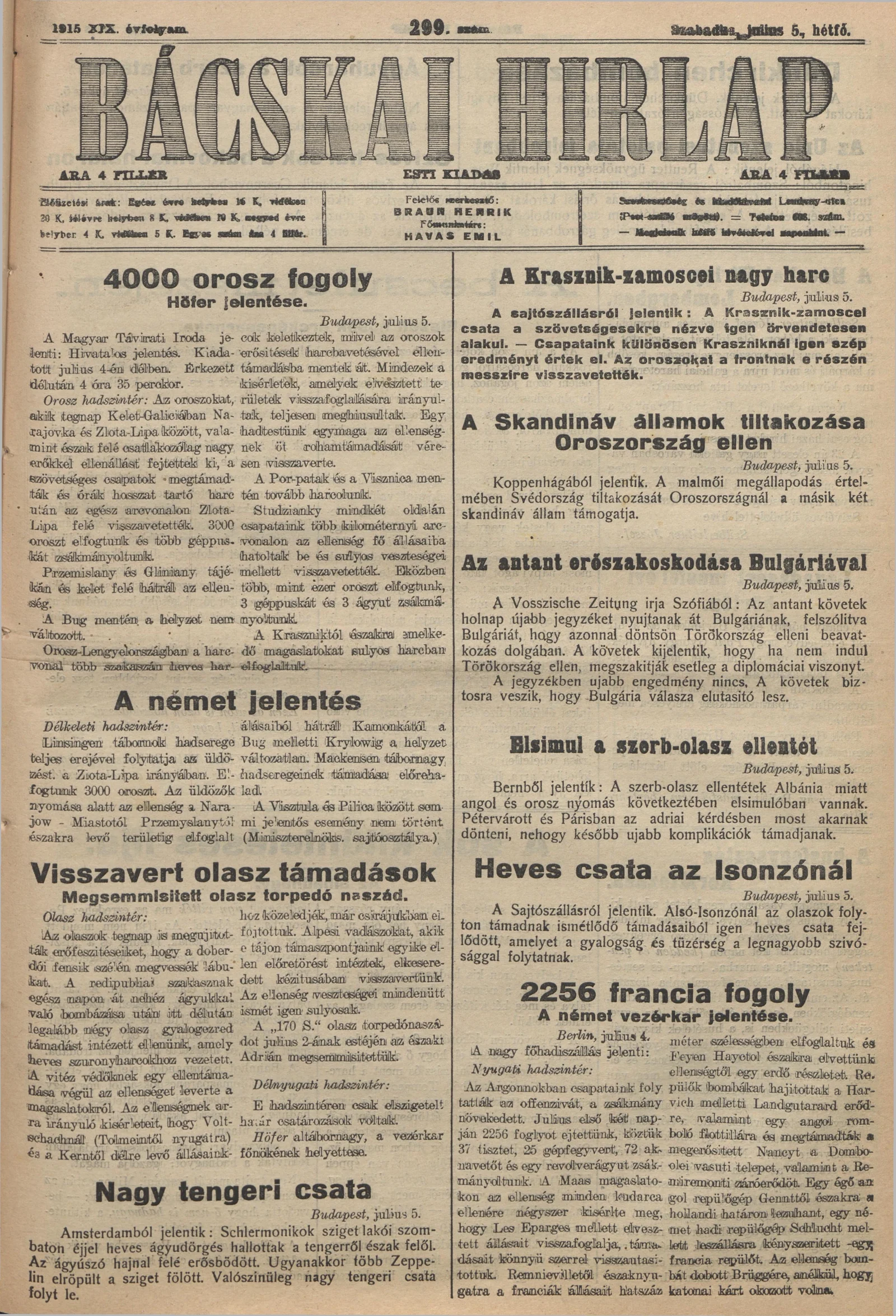 Bácskai Hirlap, 19. évf. 1915. július 5. 299. sz.