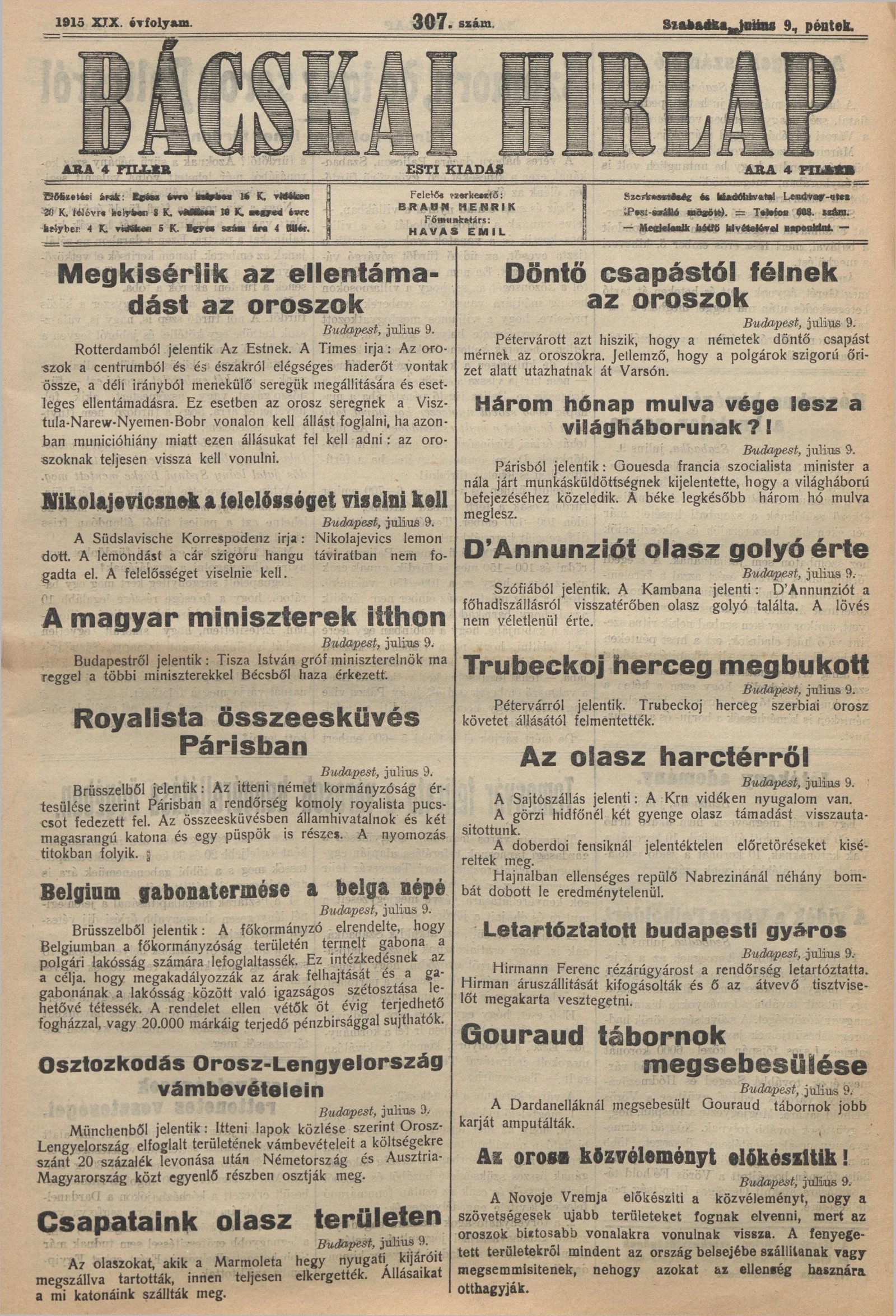 Bácskai Hirlap, 19. évf. 1915. július 9. 307. sz.