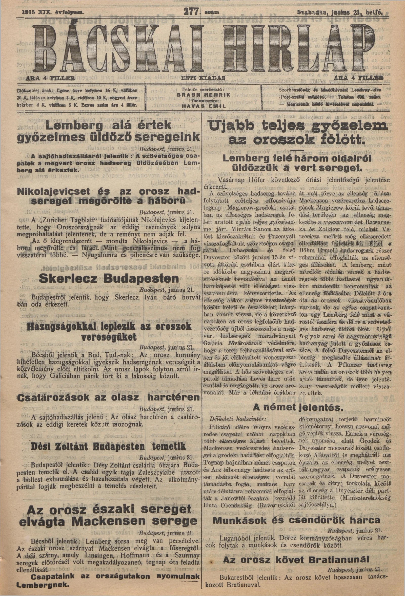 Bácskai Hirlap, 19. évf. 1915. június 21. 277. sz.