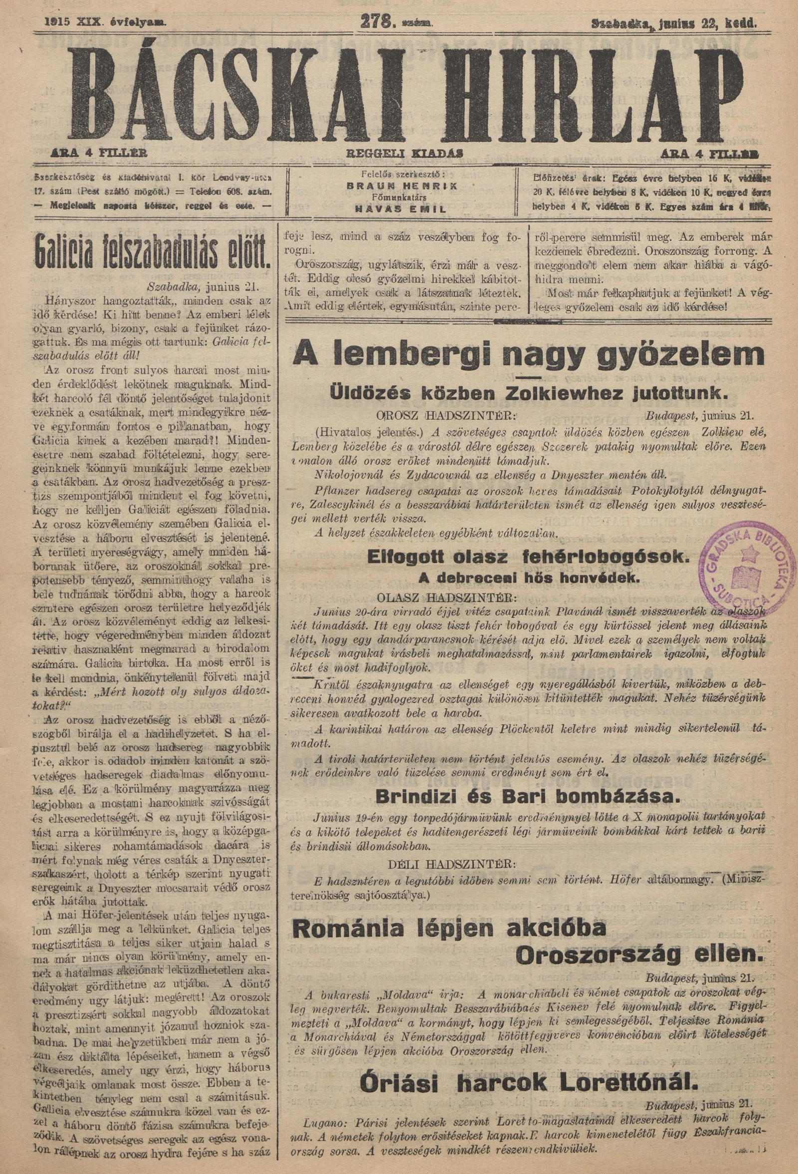 Bácskai Hirlap, 19. évf. 1915. június 22. 278. sz.