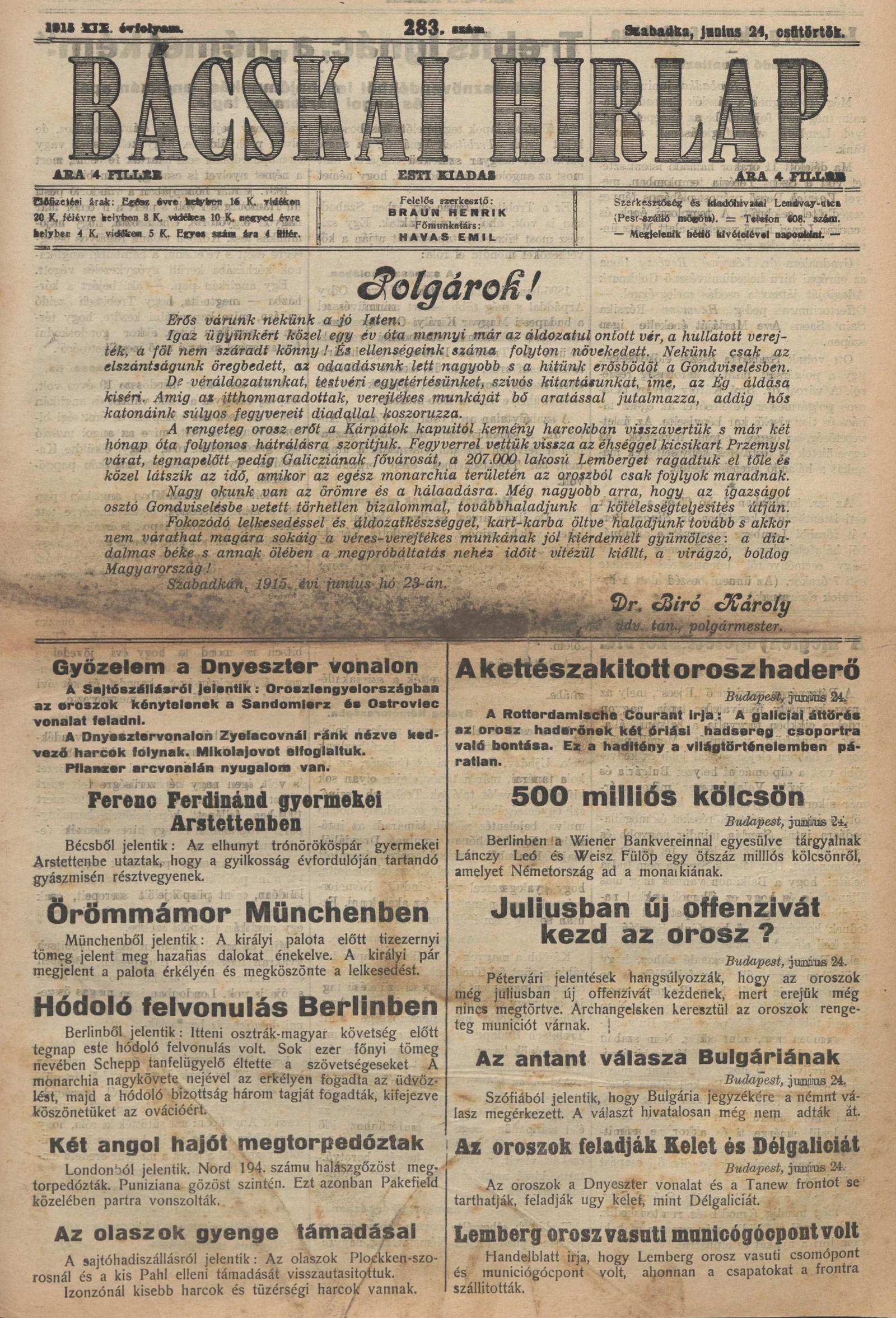 Bácskai Hirlap, 19. évf. 1915. június 24. 283. sz.