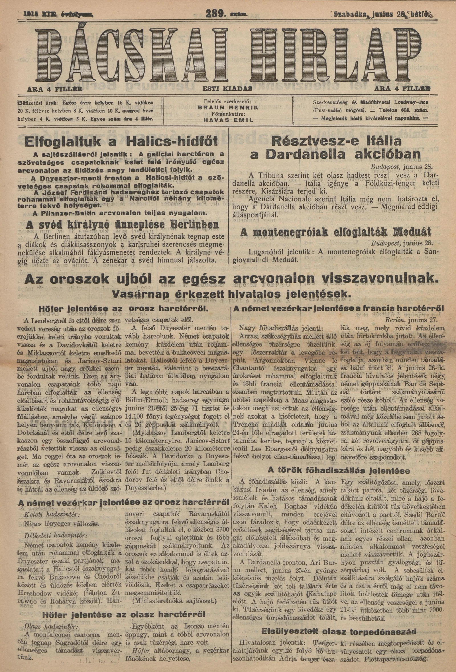 Bácskai Hirlap, 19. évf. 1915. június 28. 289. sz.
