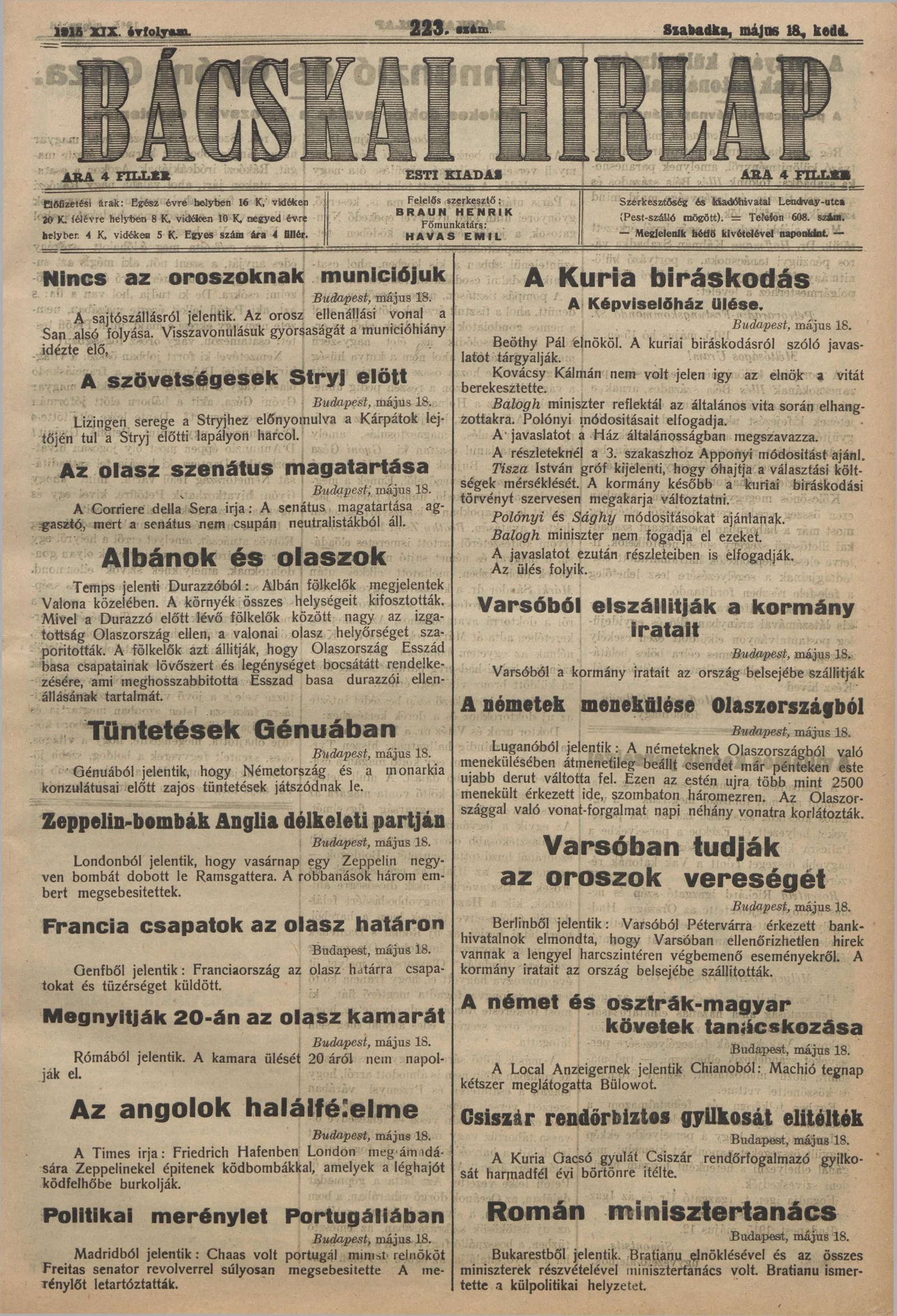 Bácskai Hirlap, 19. évf. 1915. május 18. 223. sz.