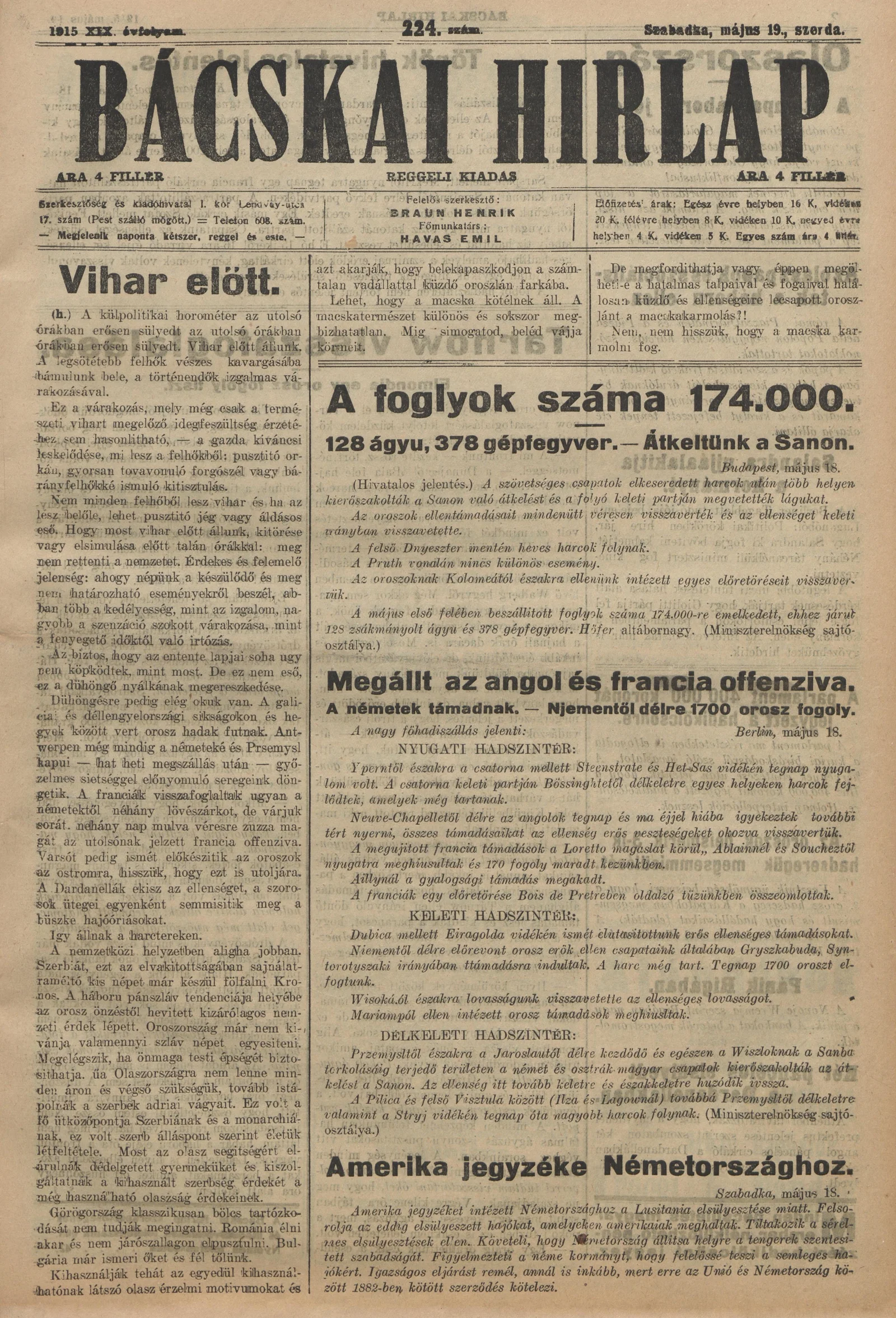 Bácskai Hirlap, 19. évf. 1915. május 19. 224. sz.