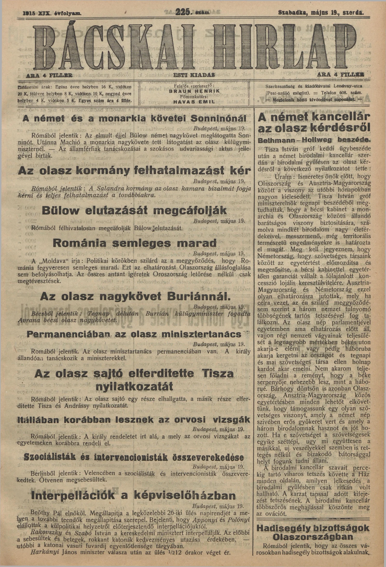 Bácskai Hirlap, 19. évf. 1915. május 19. 225. sz.