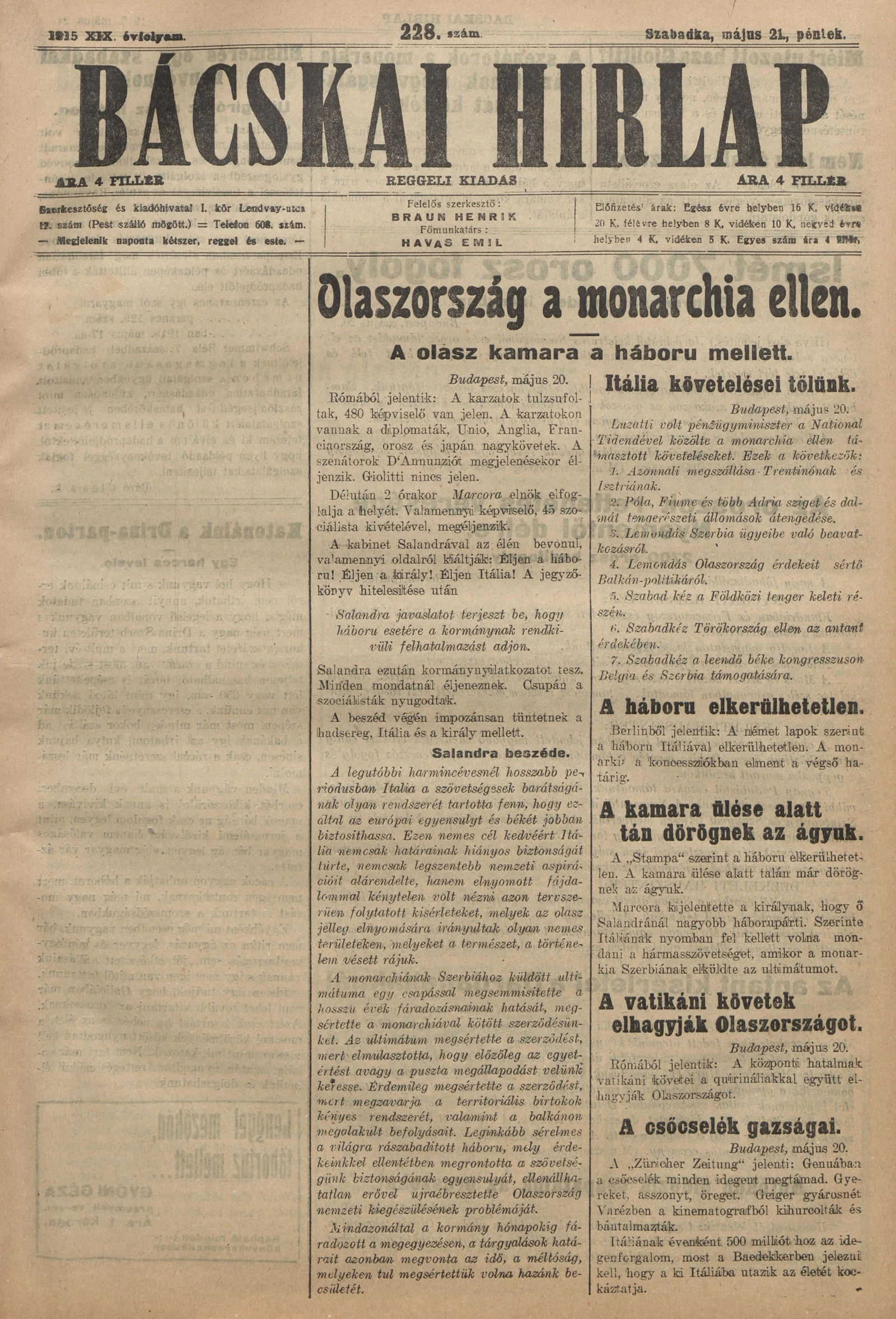 Bácskai Hirlap, 19. évf. 1915. május 21. 228. sz.