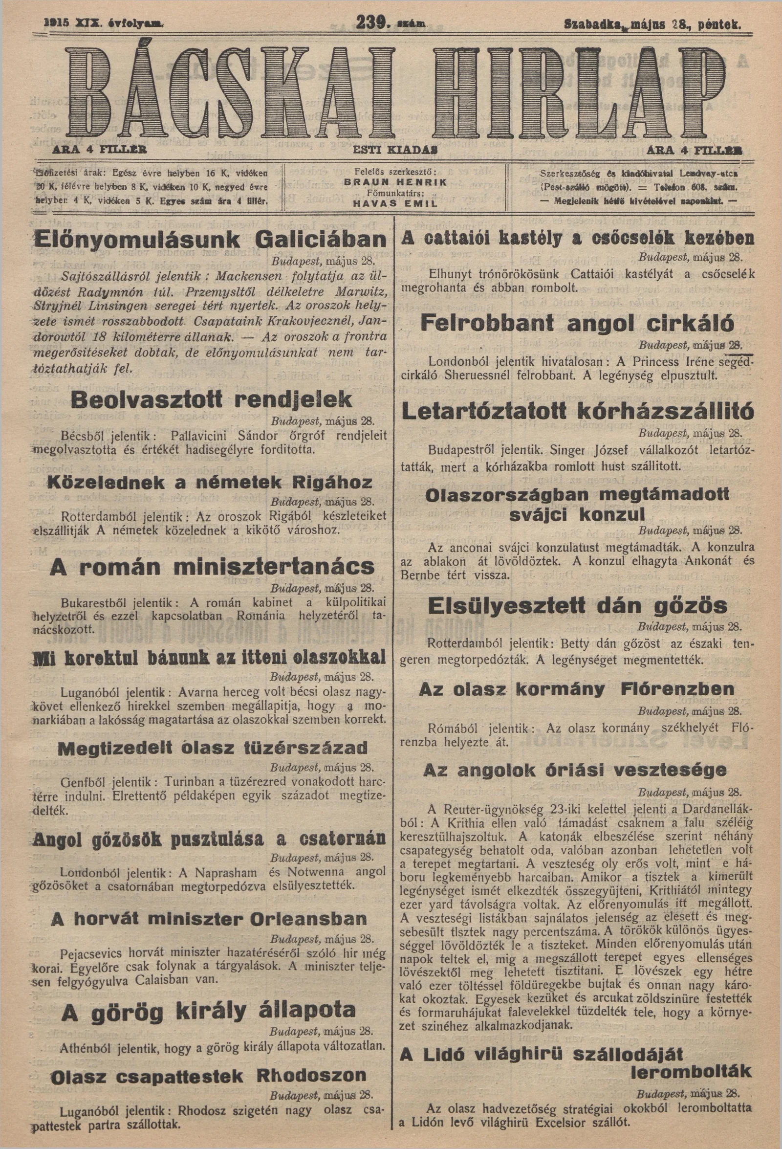 Bácskai Hirlap, 19. évf. 1915. május 28. 239. sz.