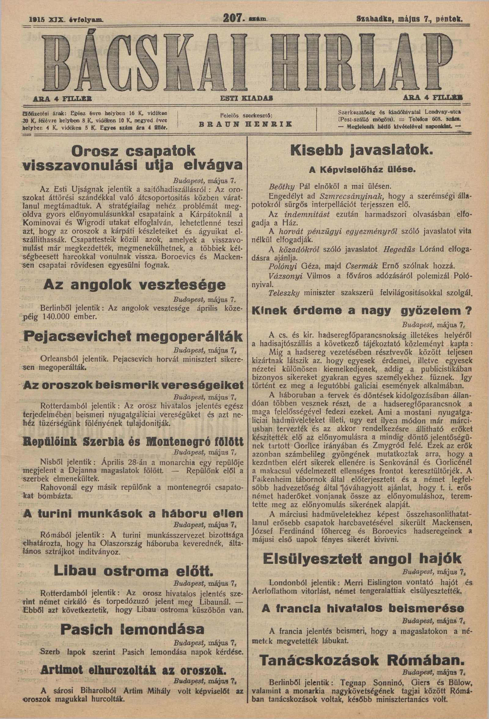 Bácskai Hirlap, 19. évf. 1915. május 7. 207. sz.