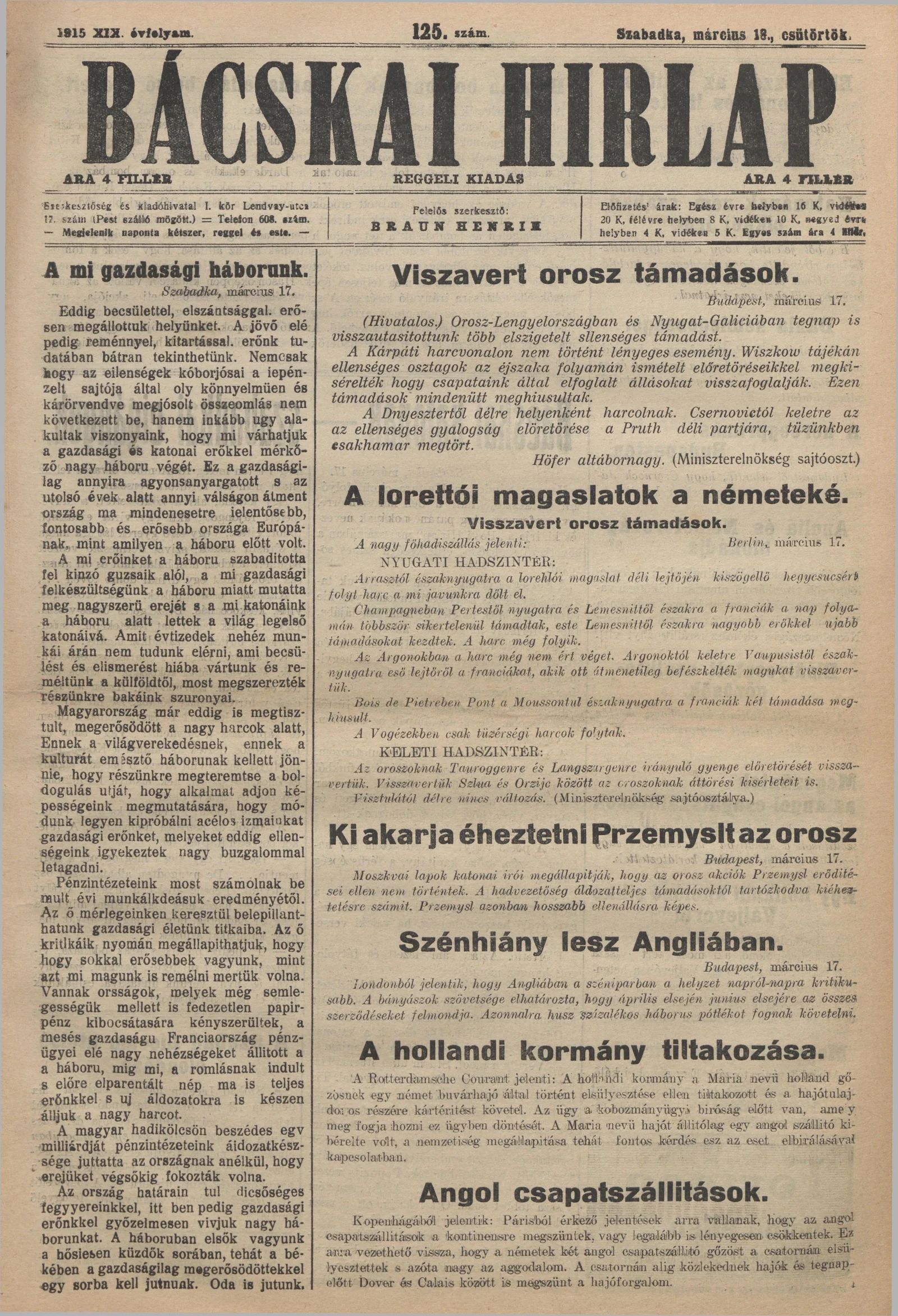 Bácskai Hirlap, 19. évf. 1915. március 18. 125. sz.