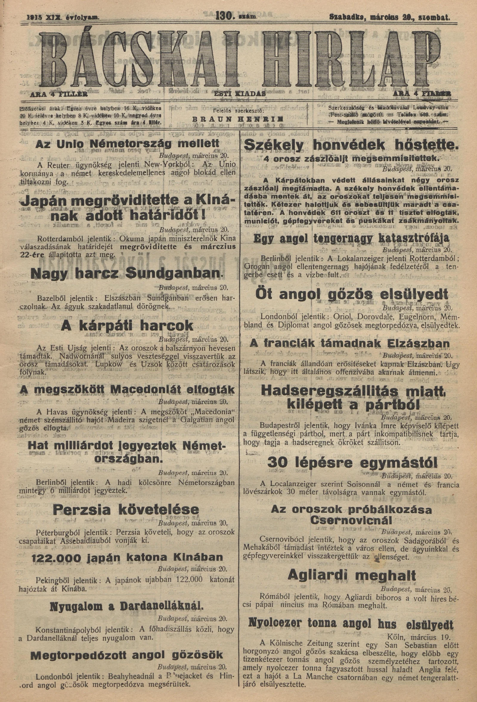 Bácskai Hirlap, 19. évf. 1915. március 20. 130. sz.