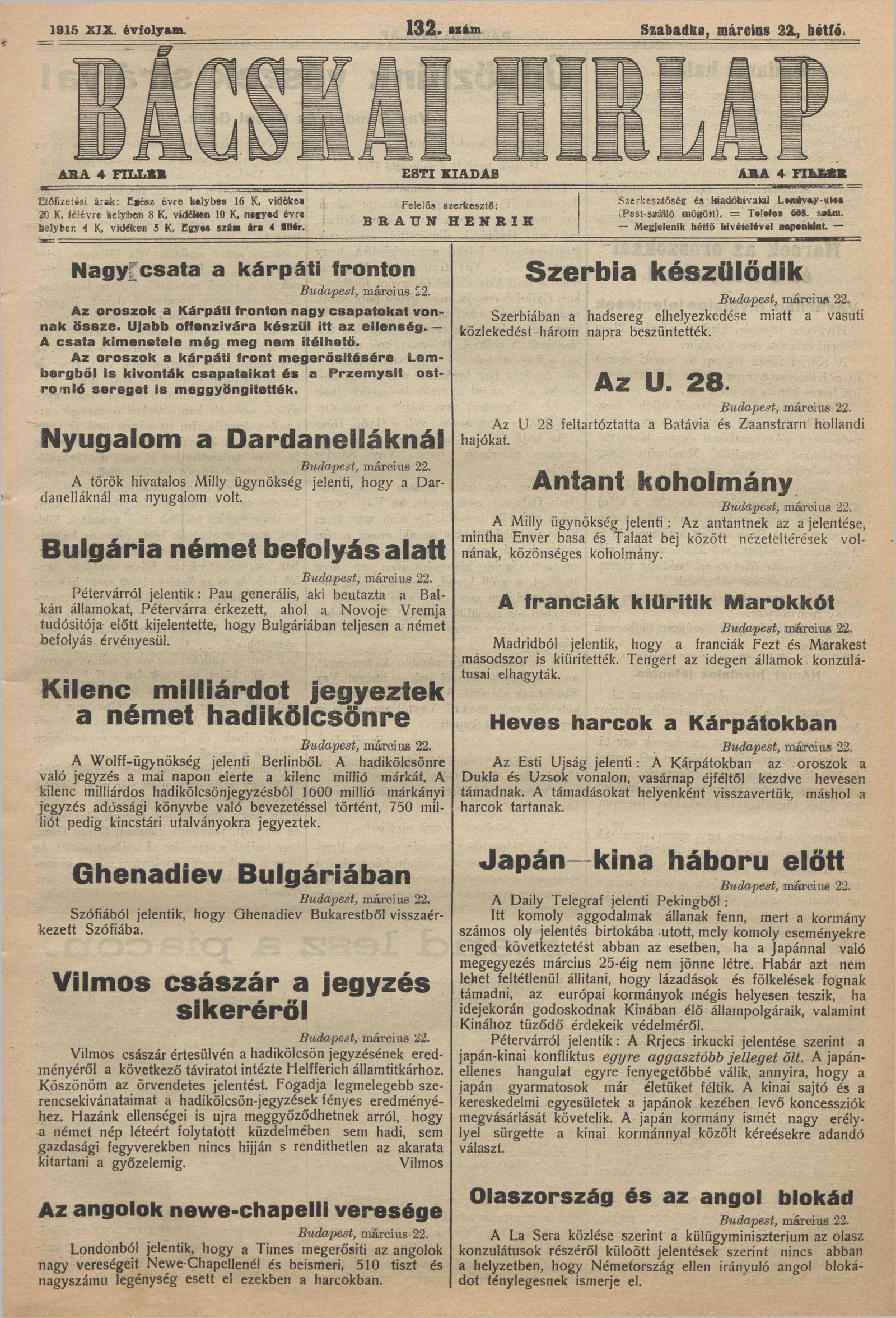 Bácskai Hirlap, 19. évf. 1915. március 22. 132. sz.