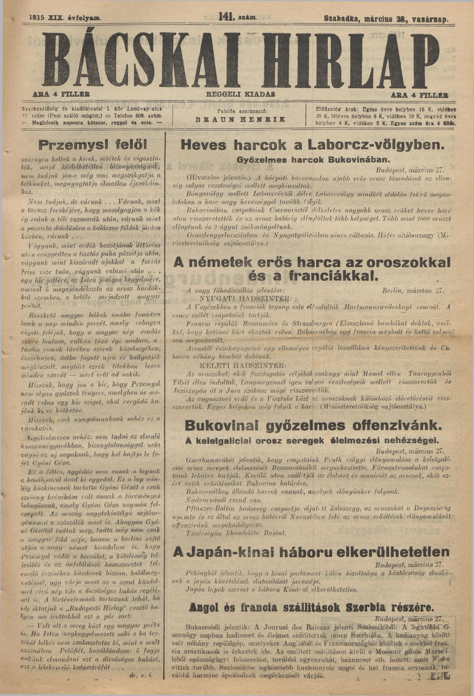 Bácskai Hirlap, 19. évf. 1915. március 28. 141. sz.