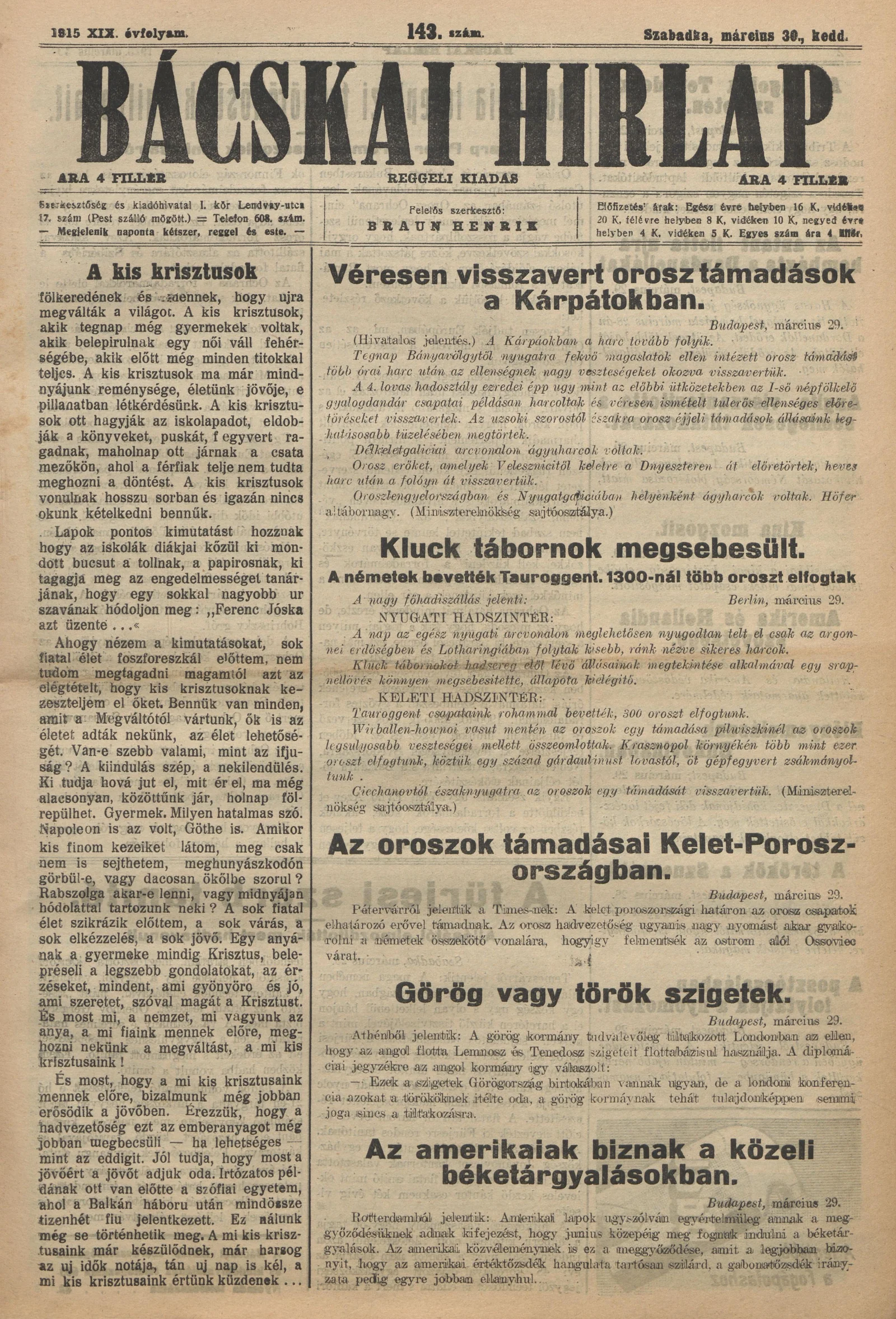 Bácskai Hirlap, 19. évf. 1915. március 30. 143. sz.