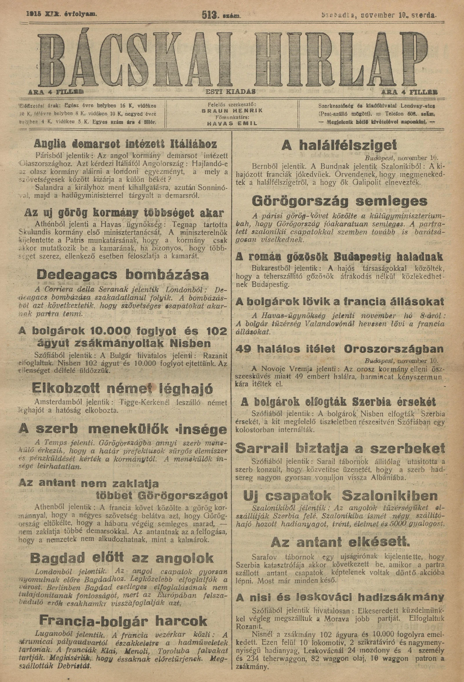 Bácskai Hirlap, 19. évf. 1915. november 10. 513. sz.