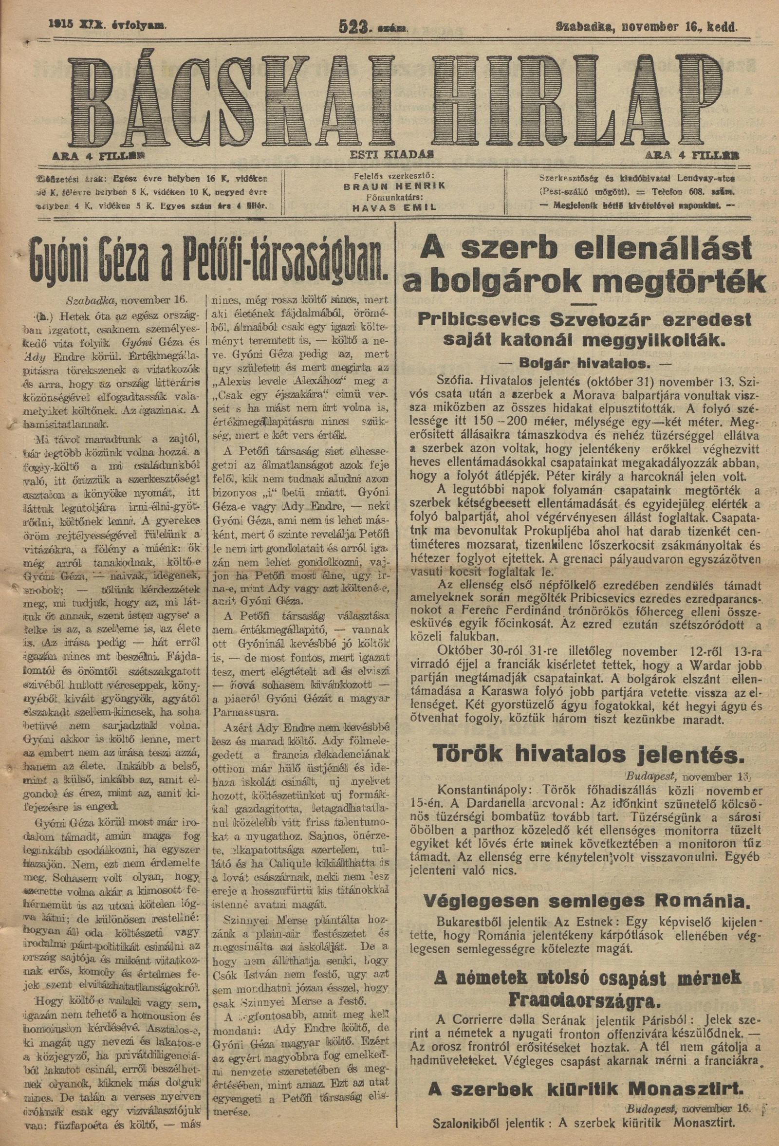 Bácskai Hirlap, 19. évf. 1915. november 16. 523. sz.