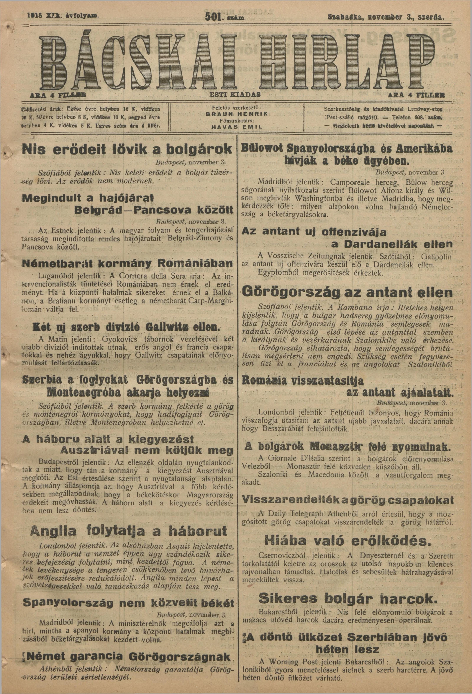 Bácskai Hirlap, 19. évf. 1915. november 3. 501. sz.