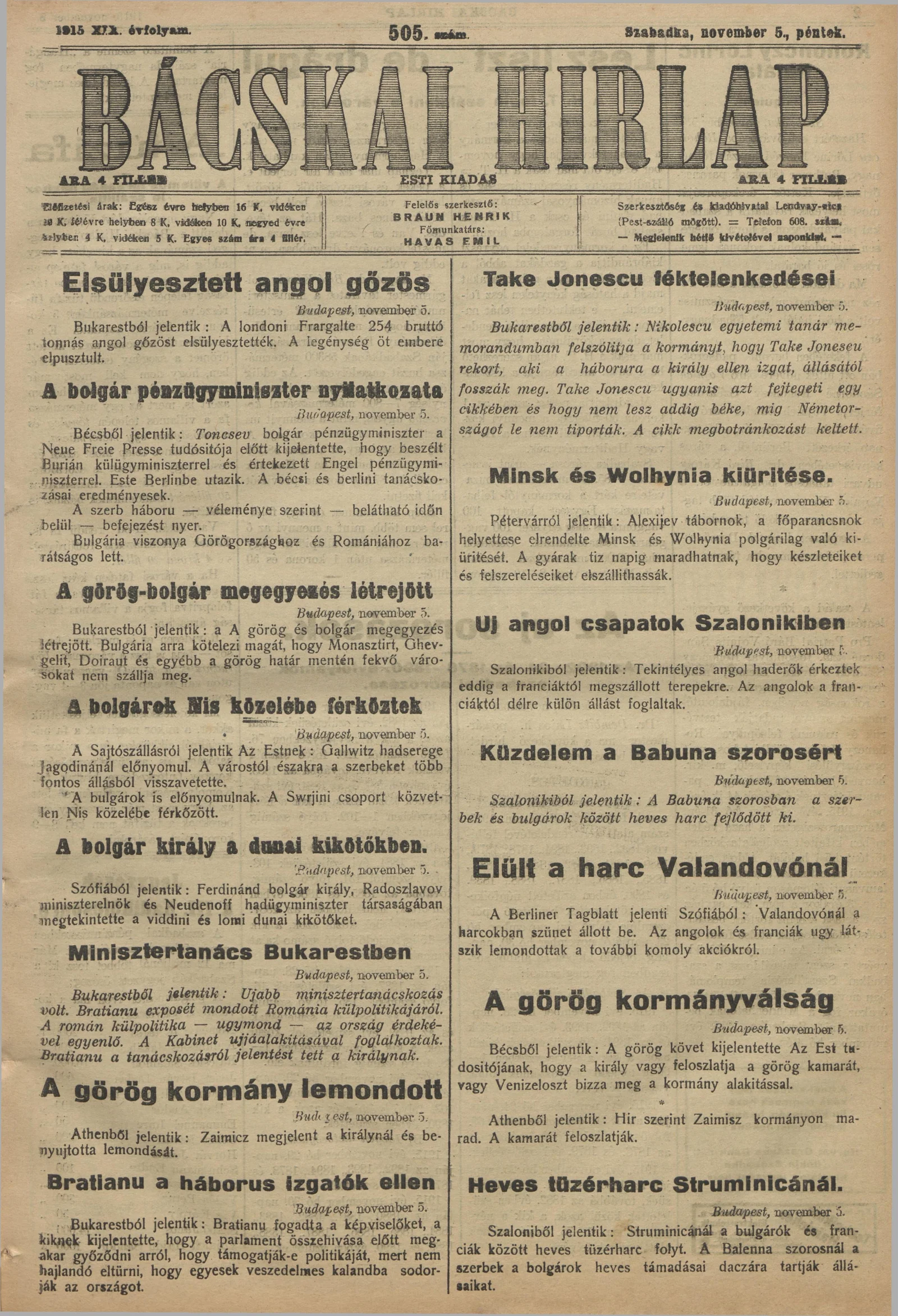 Bácskai Hirlap, 19. évf. 1915. november 5. 505. sz.