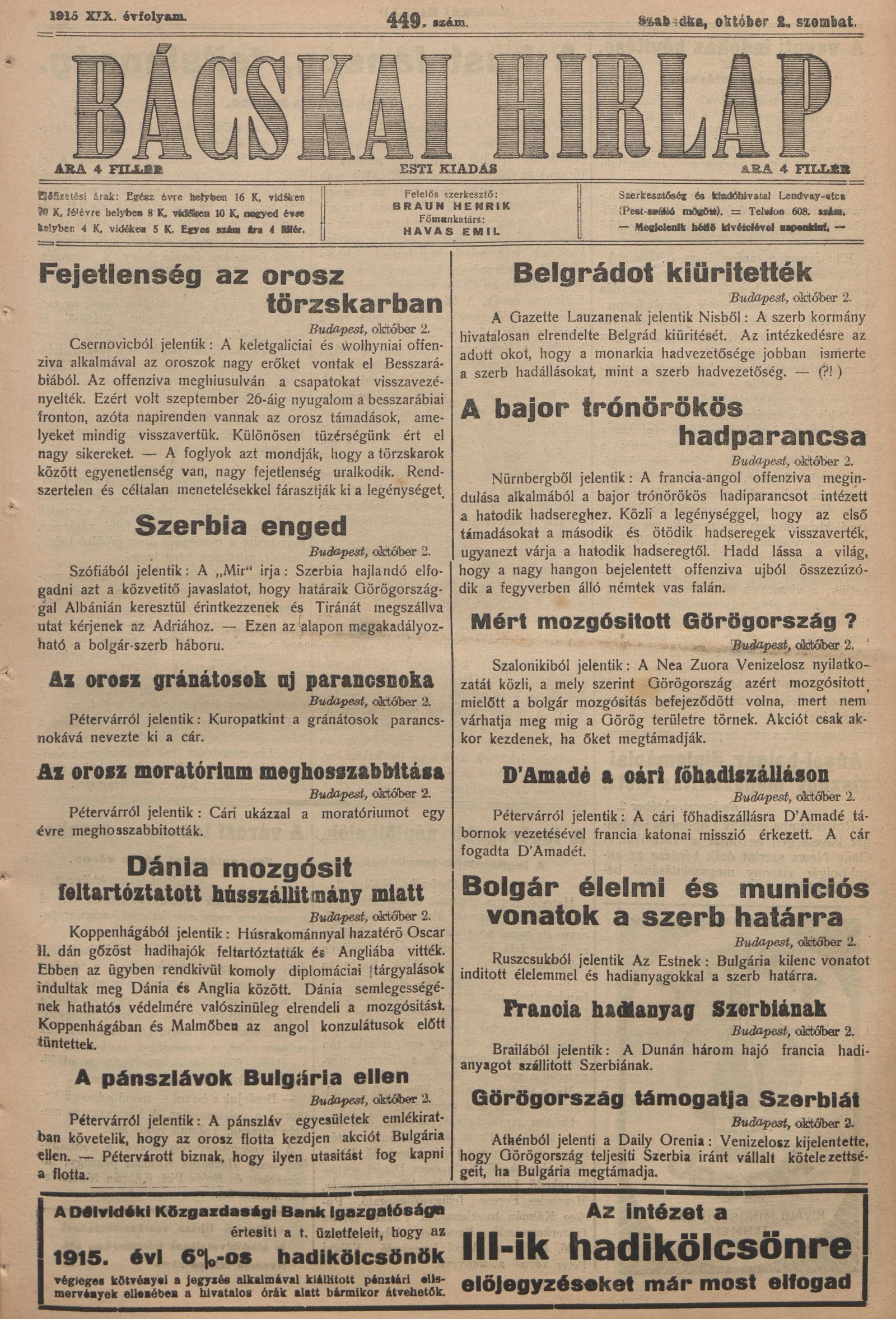 Bácskai Hirlap, 19. évf. 1915. október 2. 449. sz.