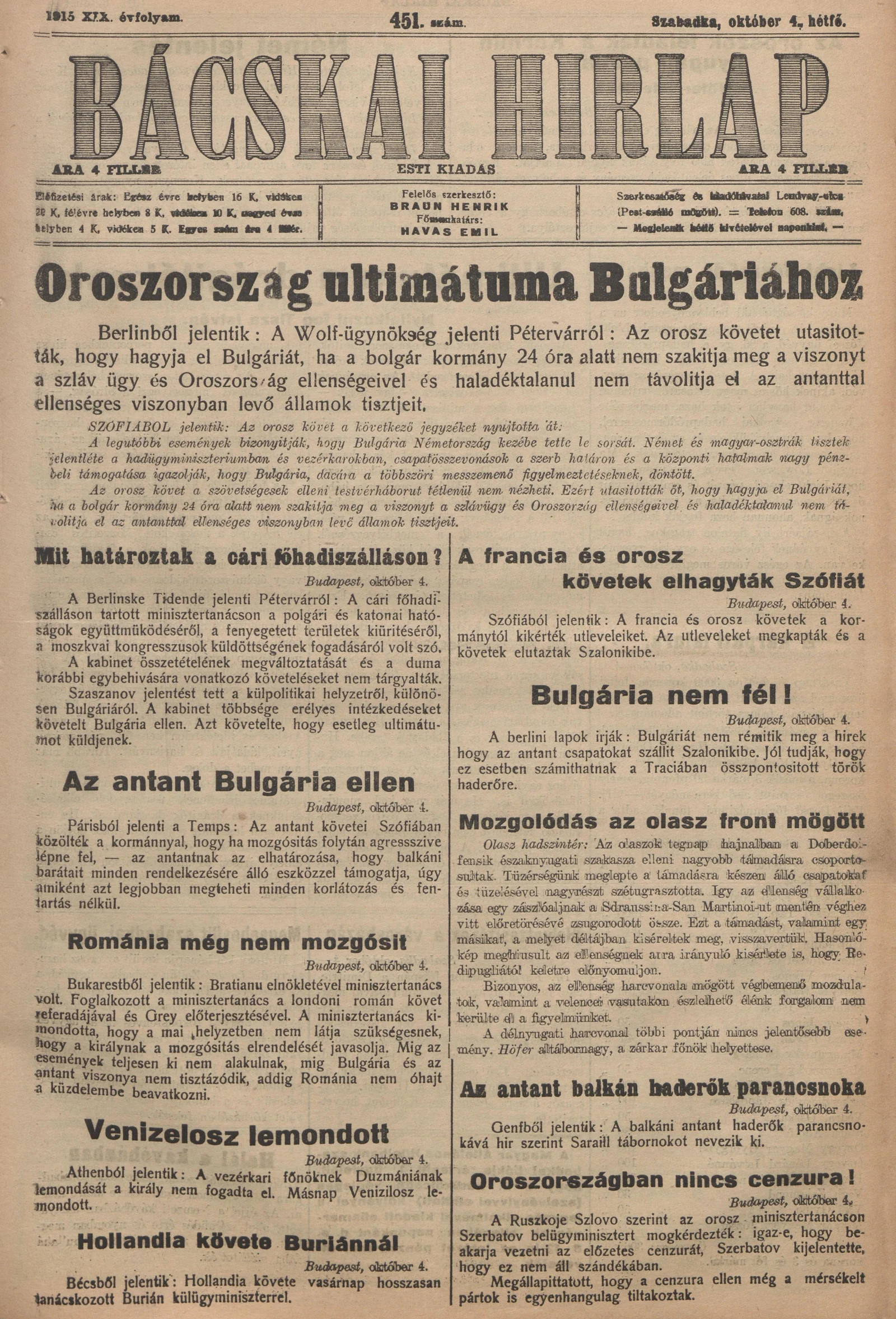 Bácskai Hirlap, 19. évf. 1915. október 4. 451. sz.