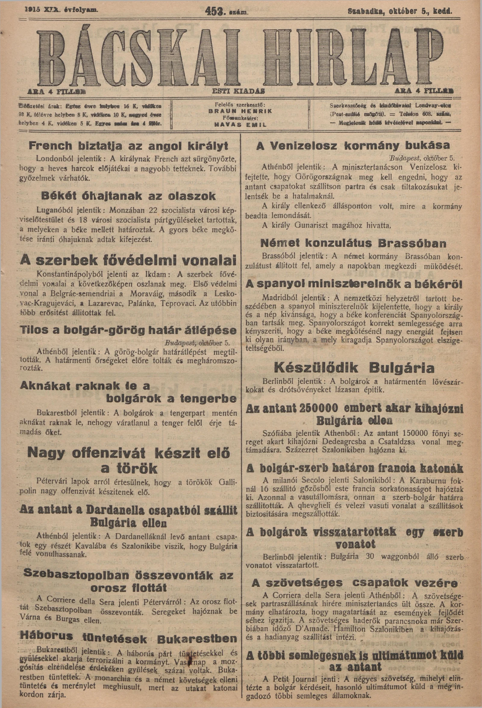 Bácskai Hirlap, 19. évf. 1915. október 5. 453. sz.