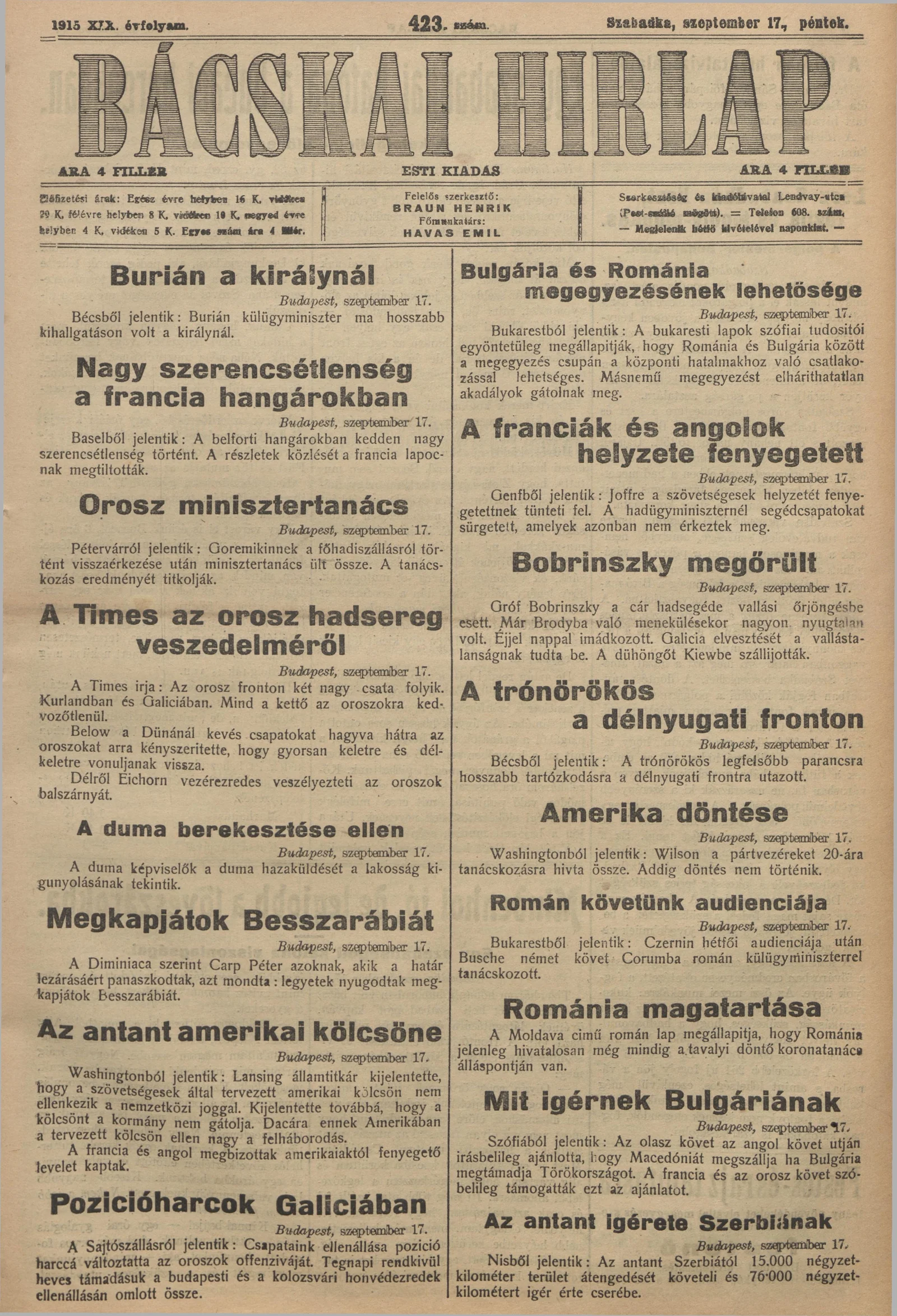 Bácskai Hirlap, 19. évf. 1915. szeptember 17. 423. sz.