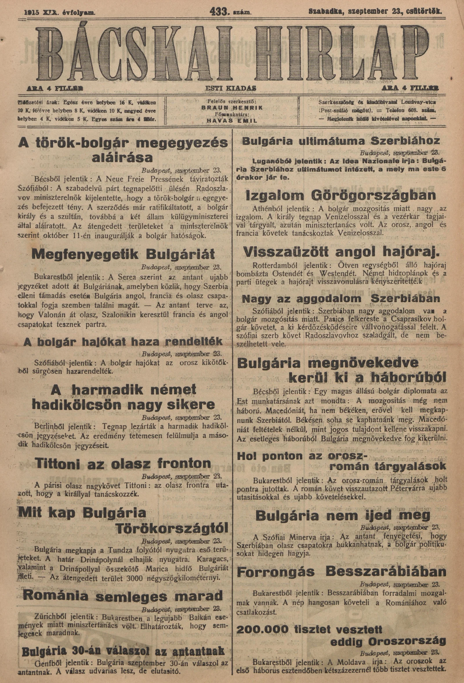 Bácskai Hirlap, 19. évf. 1915. szeptember 23. 433. sz.