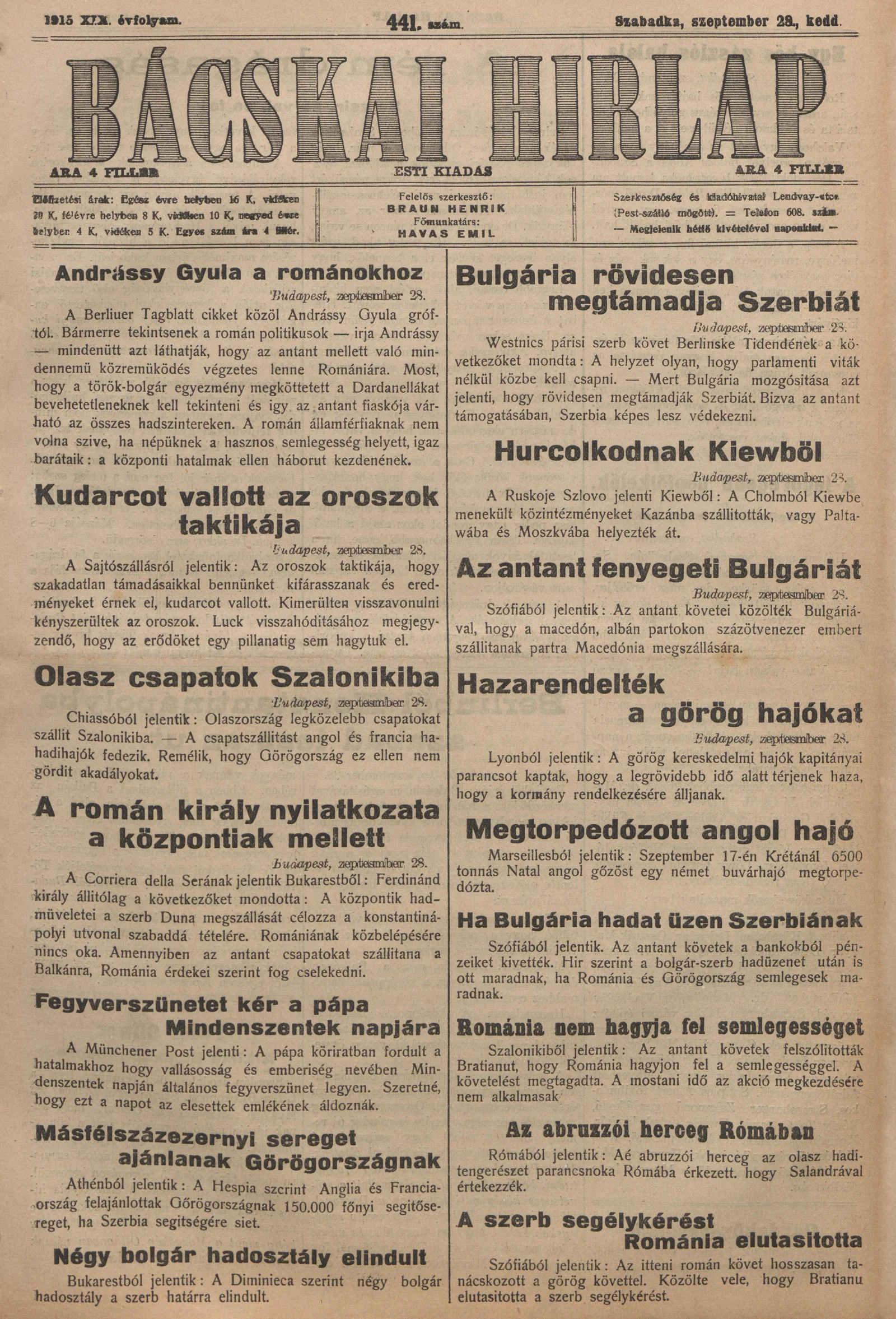 Bácskai Hirlap, 19. évf. 1915. szeptember 28. 441. sz.