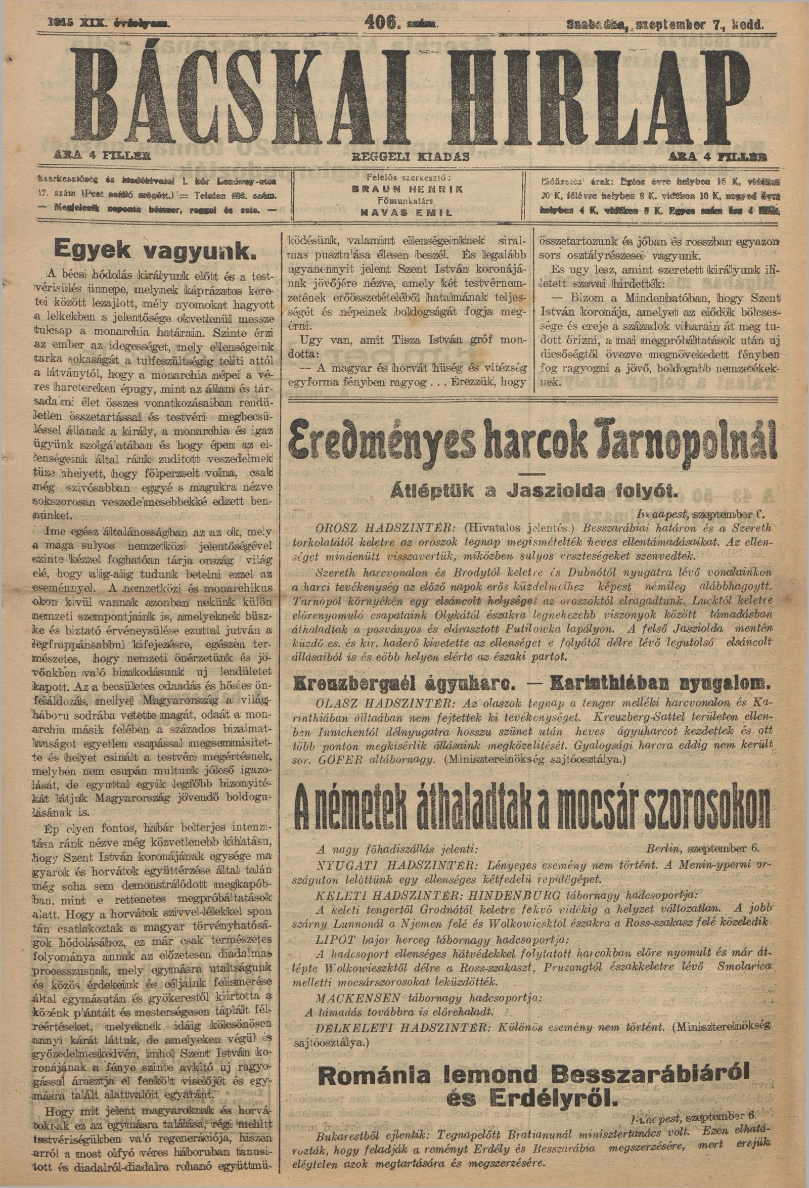 Bácskai Hirlap, 19. évf. 1915. szeptember 7. 406. sz.