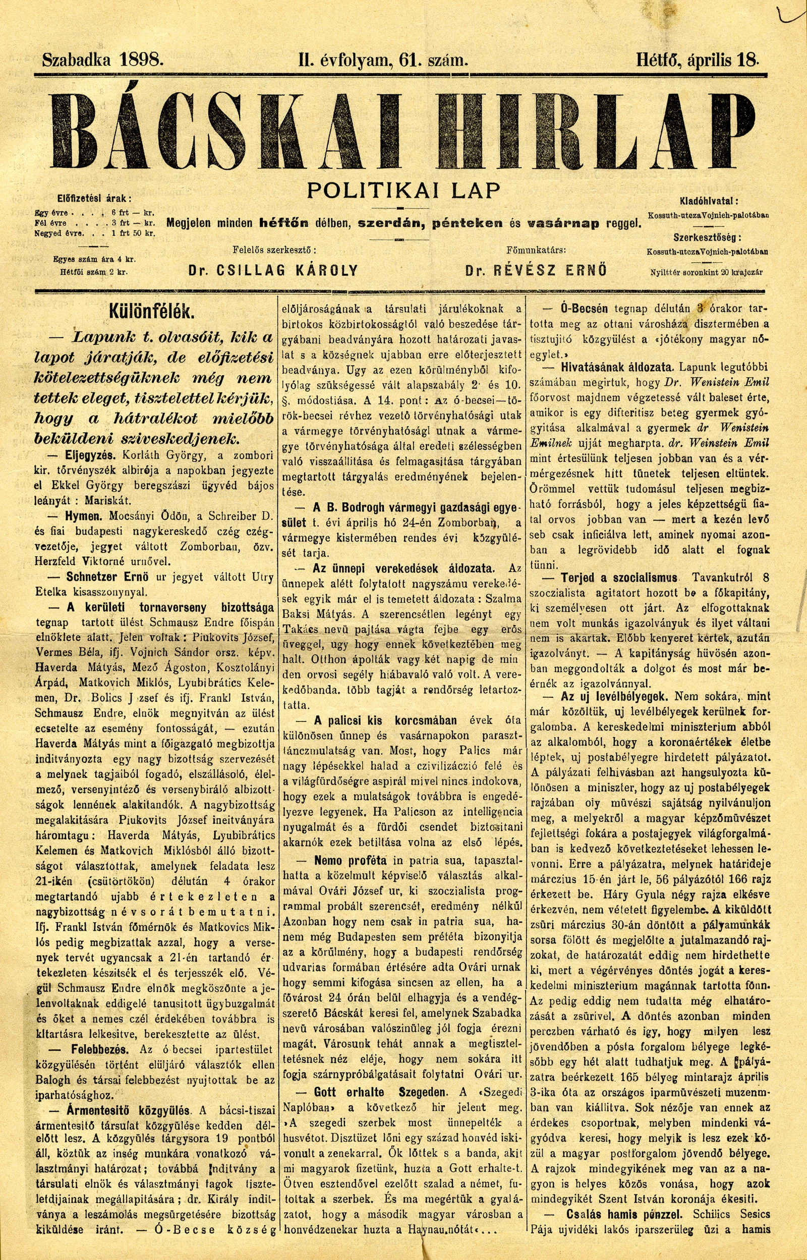 Bácskai Hirlap, 2. évf. 1898. április 18. 61. sz. 1–2. oldal