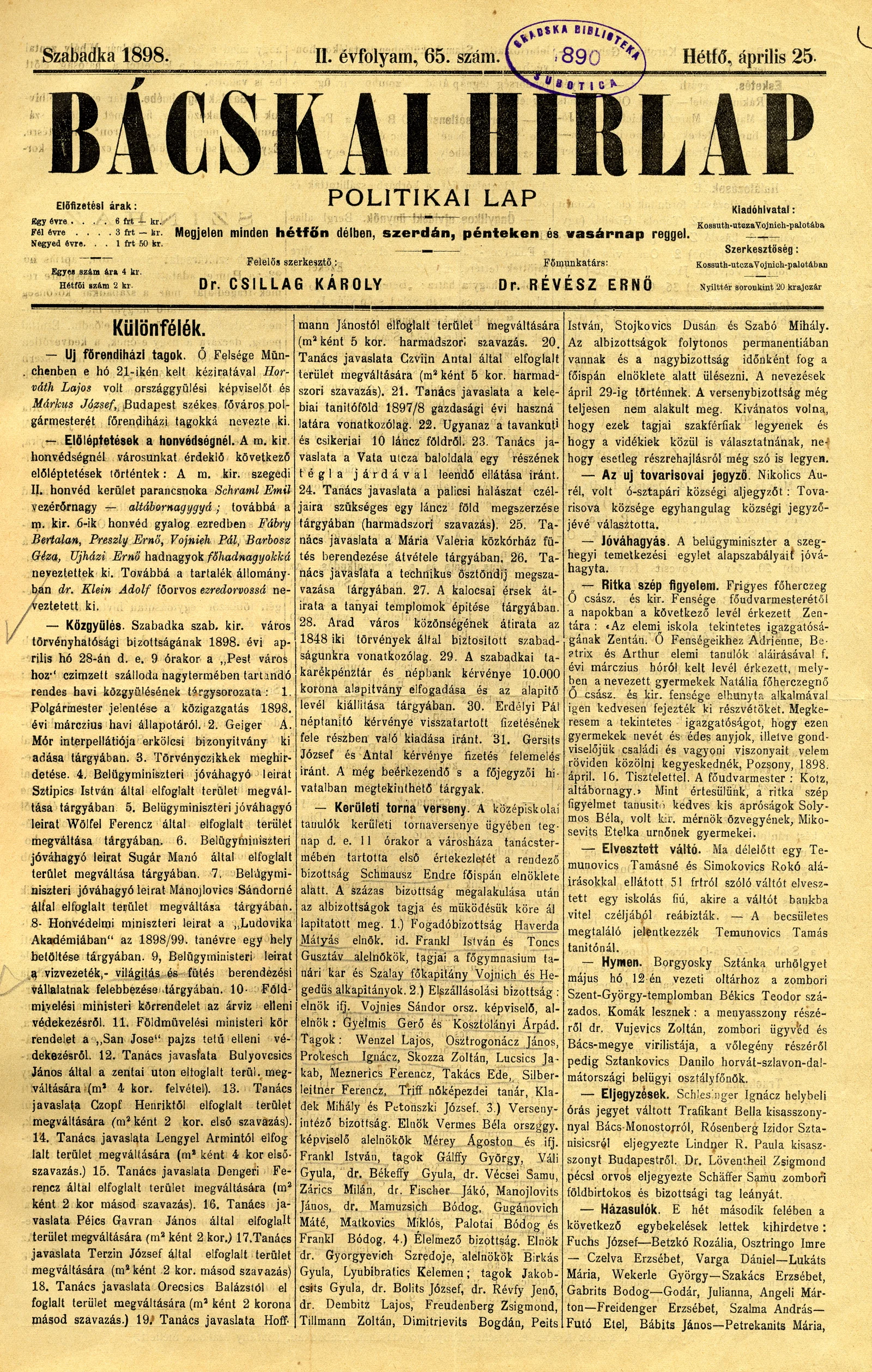 Bácskai Hirlap, 2. évf. 1898. április 25. 65. sz. 1–2. oldal