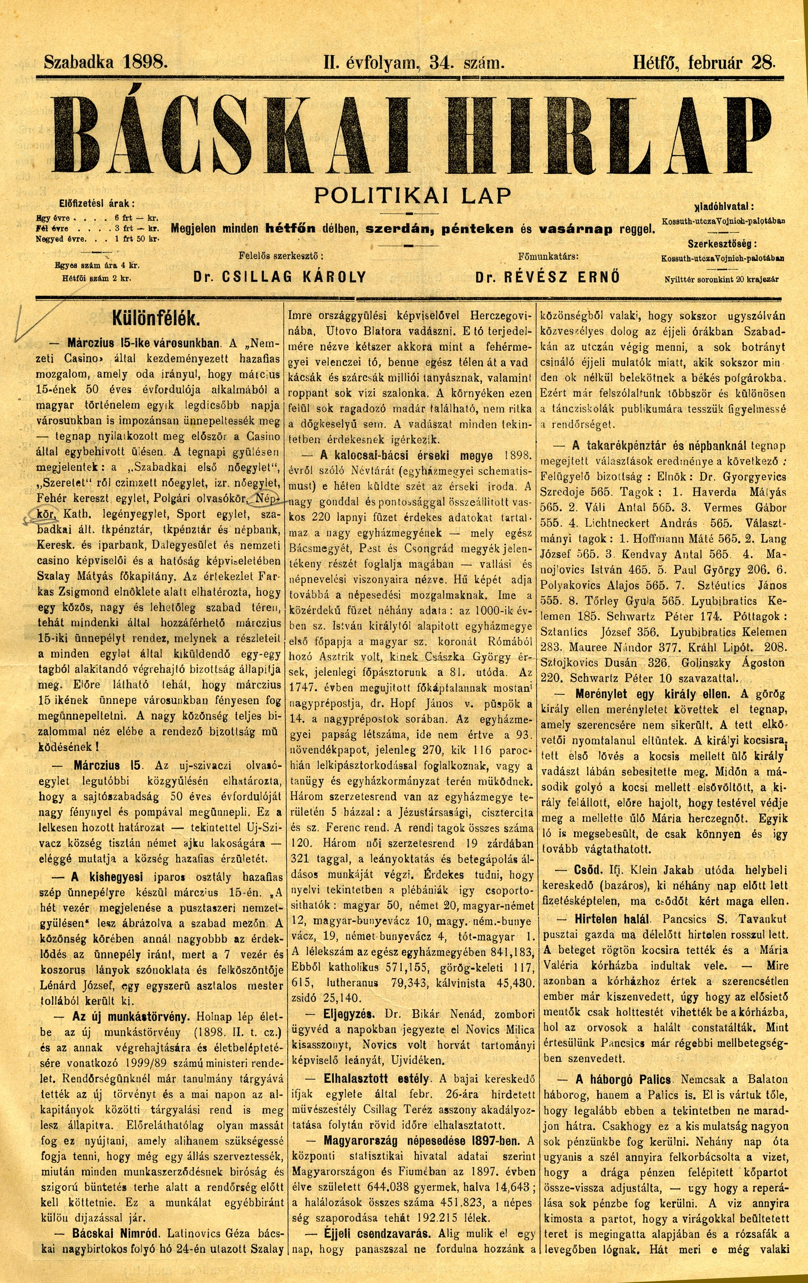 Bácskai Hirlap, 2. évf. 1898. február 28. 34. sz. 1–2. oldal