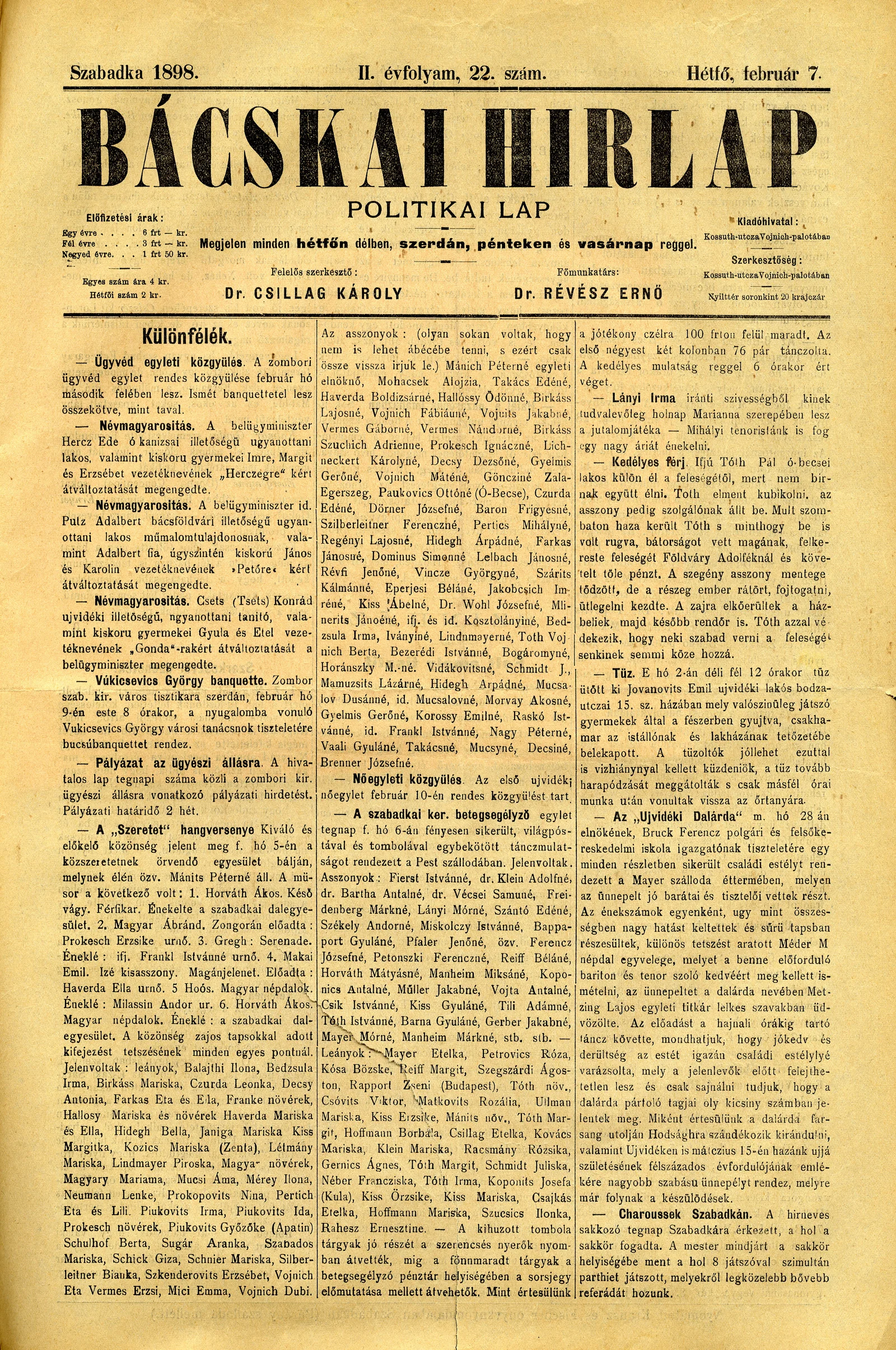 Bácskai Hirlap, 2. évf. 1898. február 7. 22. sz. 1–2. oldal