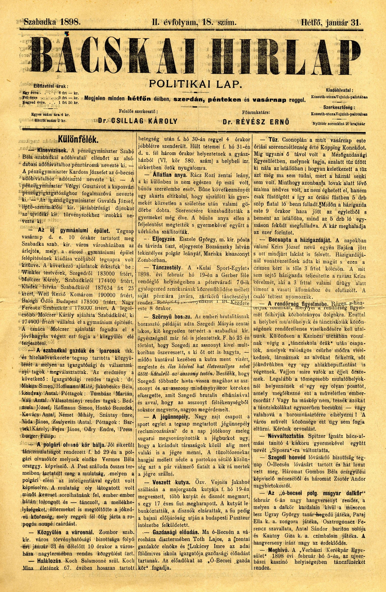 Bácskai Hirlap, 2. évf. 1898. január 31. 18. sz. 1–2. oldal