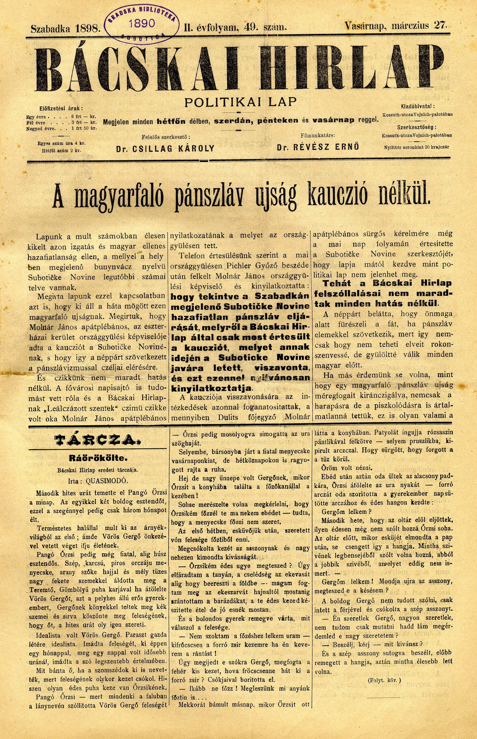 Bácskai Hirlap, 2. évf. 1898. március 27. 49. sz. 1–8. oldal