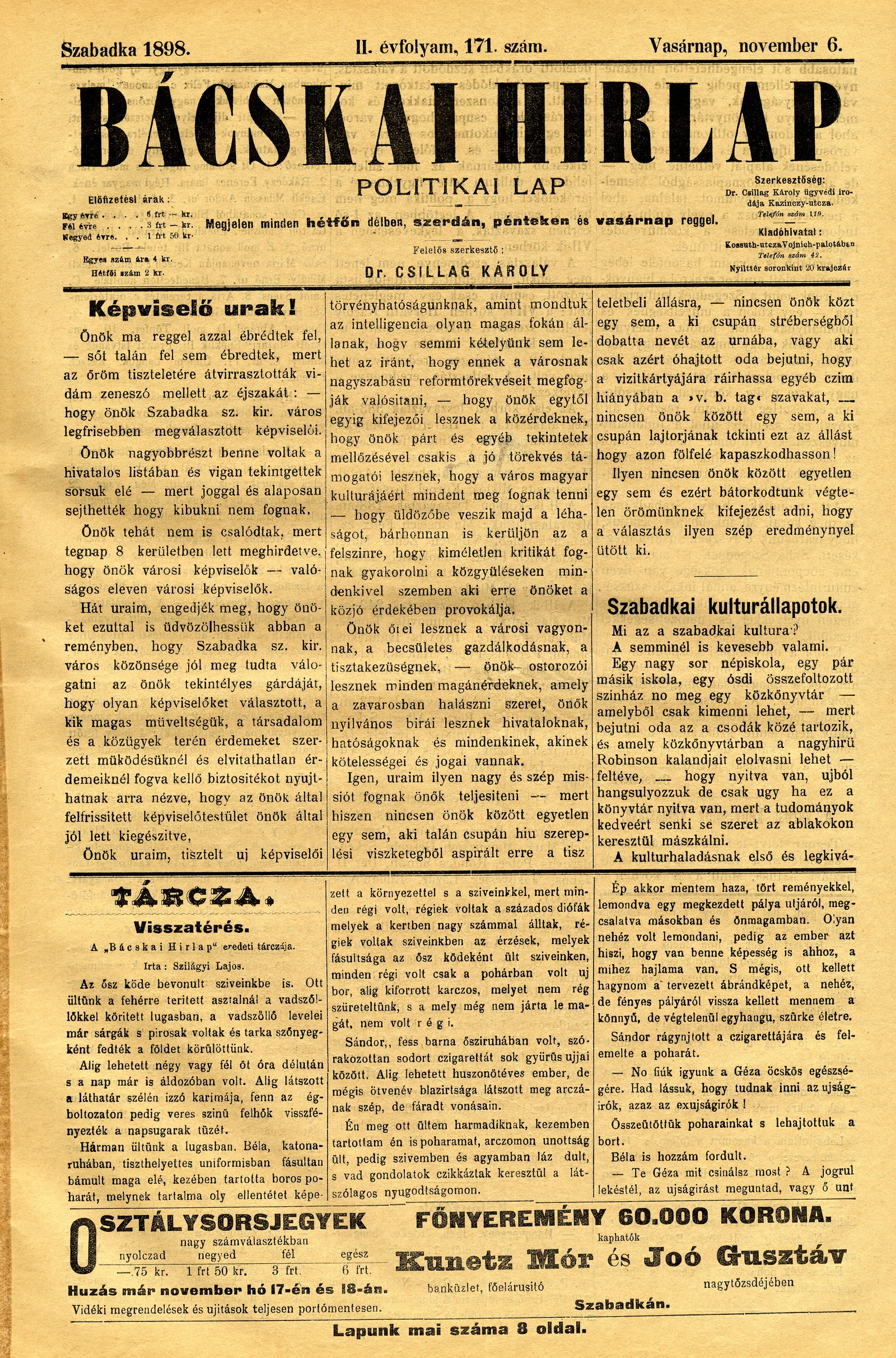 Bácskai Hirlap, 2. évf. 1898. november 6. 171. sz. 1–8. oldal