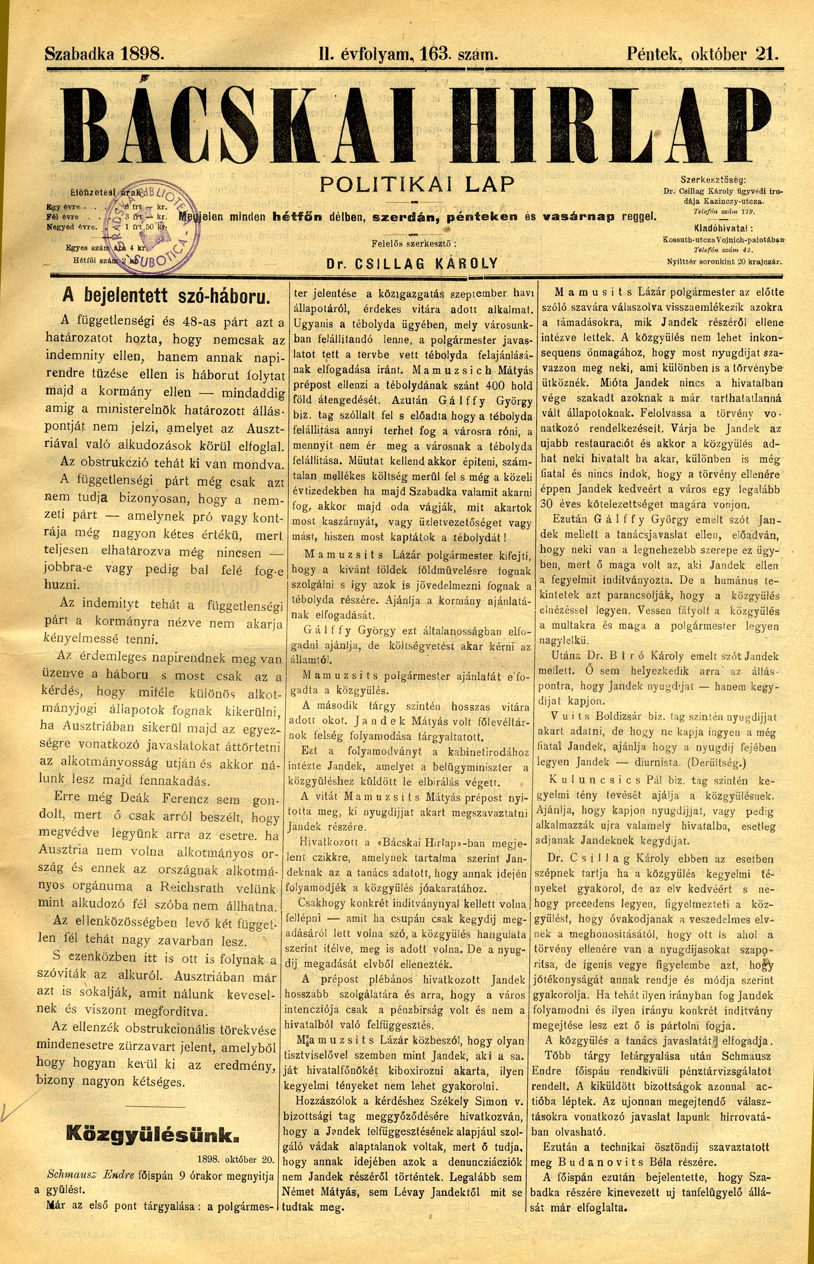 Bácskai Hirlap, 2. évf. 1898. október 21. 163. sz. 1–4. oldal