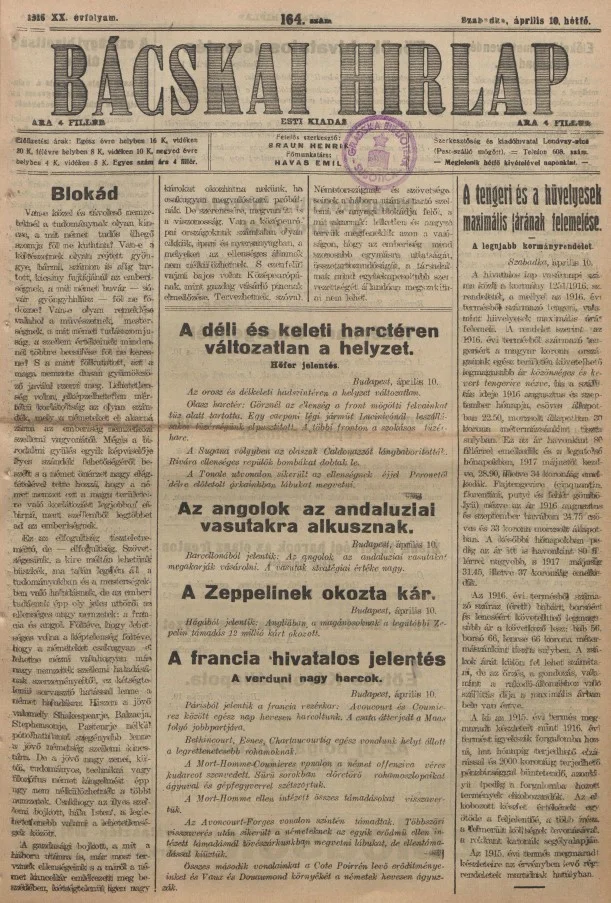 Bácskai Hirlap, 20. évf. 1916. április 10. 164. sz.