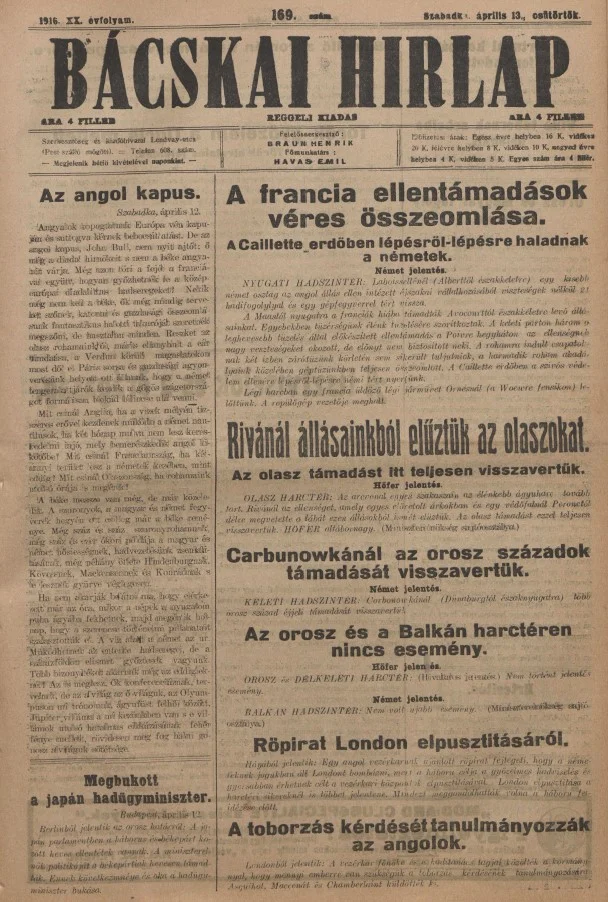 Bácskai Hirlap, 20. évf. 1916. április 13. 169. sz.