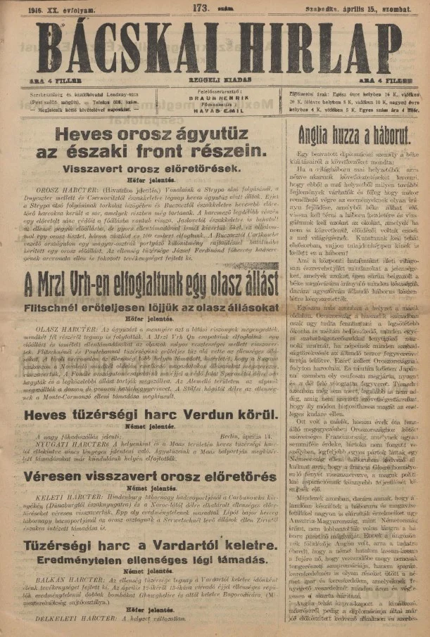 Bácskai Hirlap, 20. évf. 1916. április 15. 173. sz.