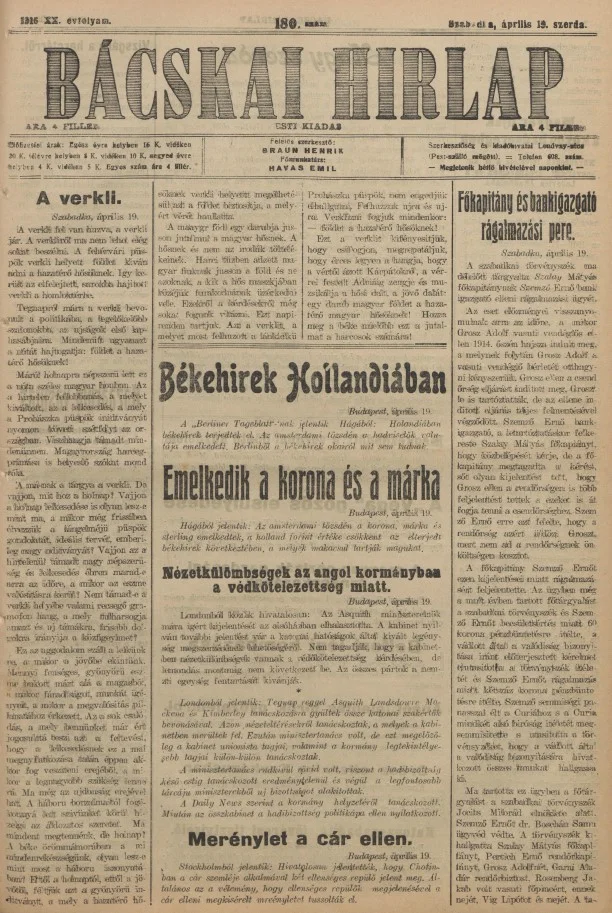 Bácskai Hirlap, 20. évf. 1916. április 19. 180. sz.